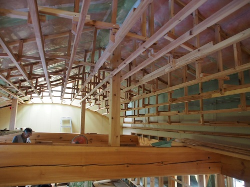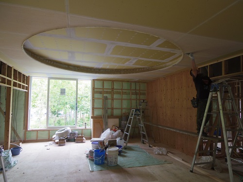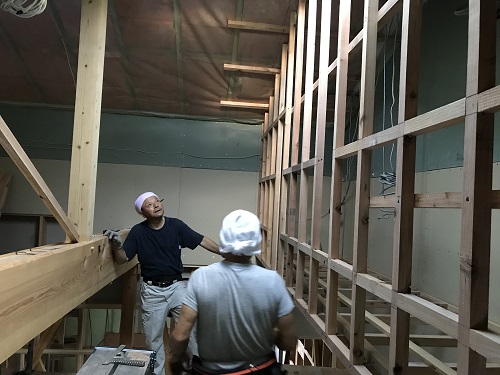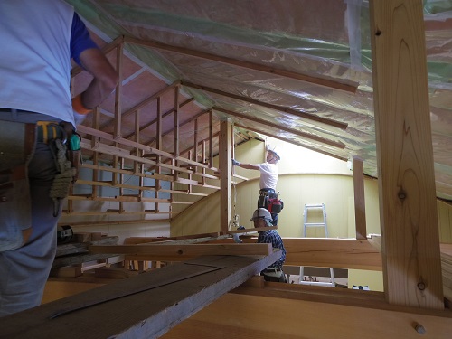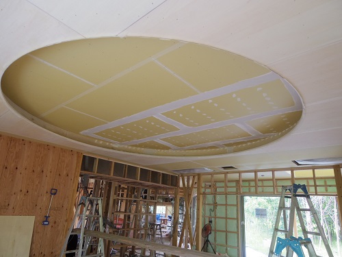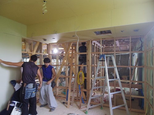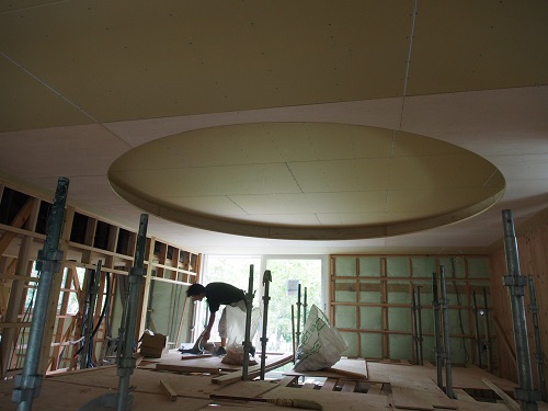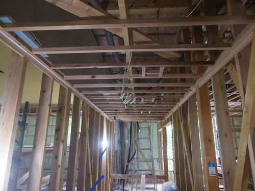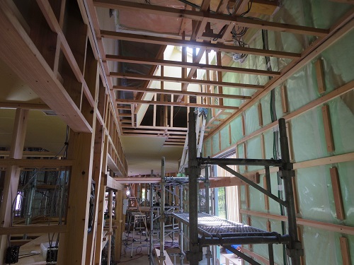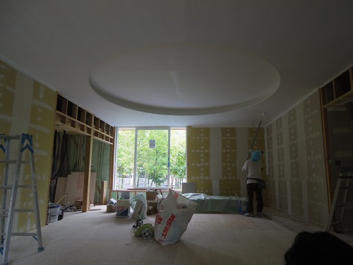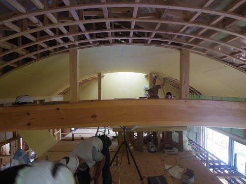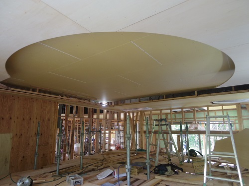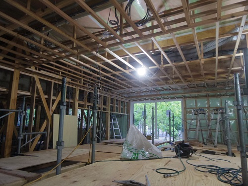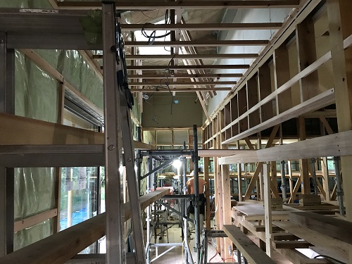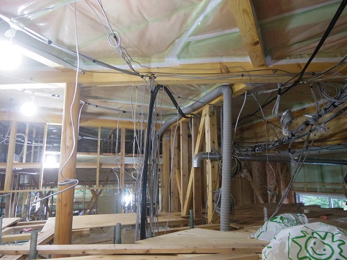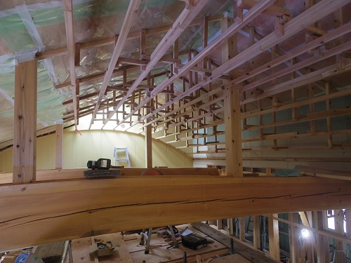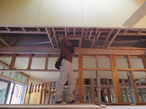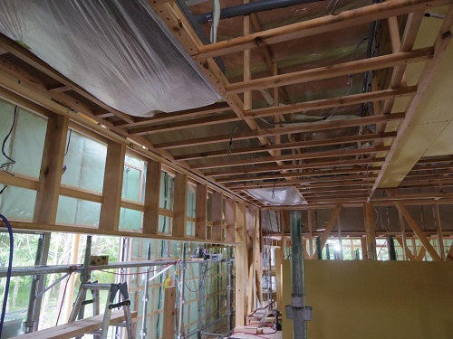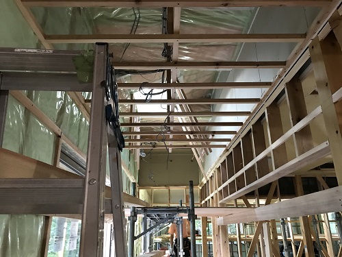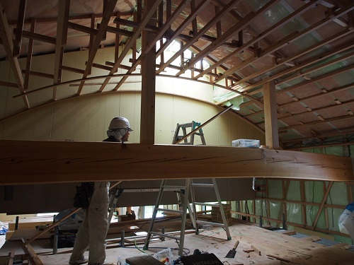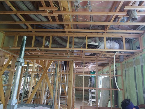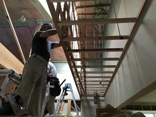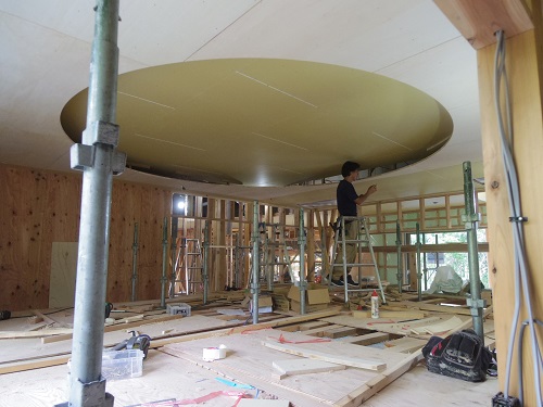 天井の下地工事が芸術的で、仕上がるとこれが見えなくなるのがもったいない感じです。