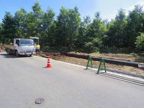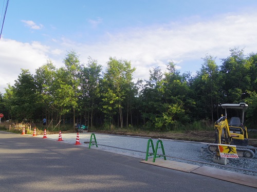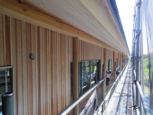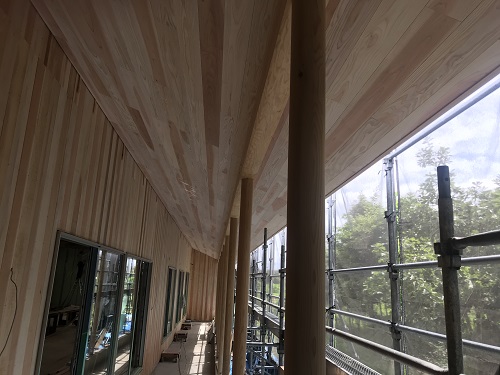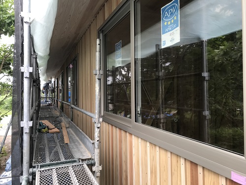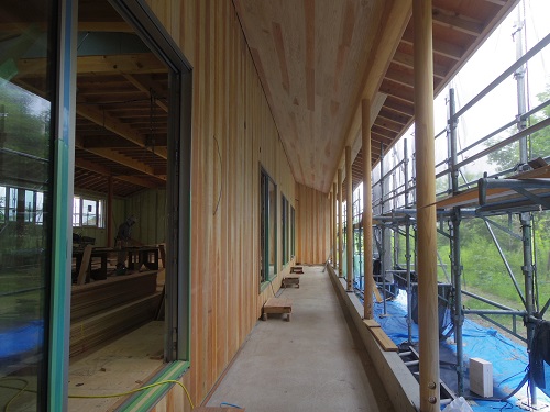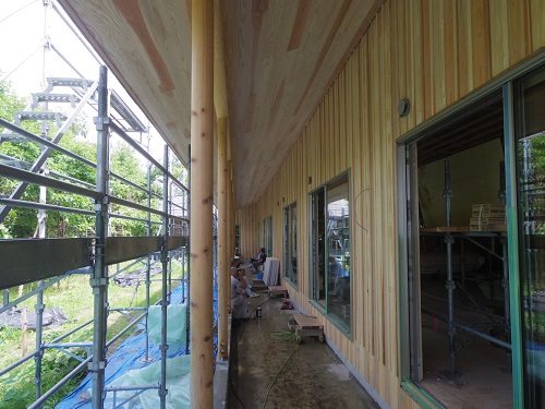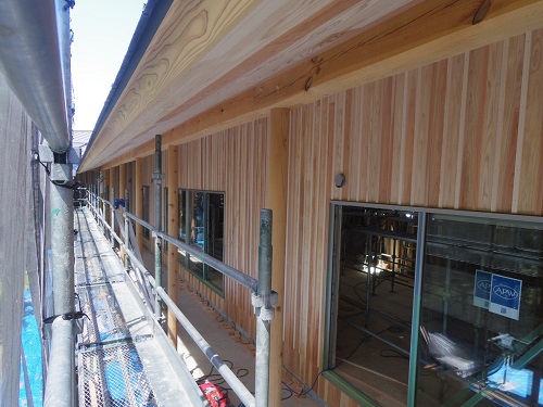 外壁を張り上げて内部の壁下地も進んでいる保育園の現場です。晴れ間での外部工事も進めています。