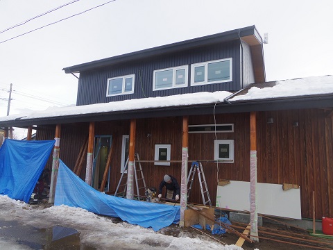 本日で外部の工事が完了する予定の上太田の大改修現場です。軒が外壁を守る想定の下屋付玄関アプローチがいい雰囲気です。2階の窓からは、岩手山が望めるので最高な眺めです。