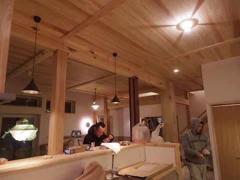 完成間近の上太田大改修です。照明の明かりも加わりとても素敵な雰囲気の室内になりました。