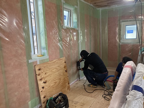 防湿シートを張り終えて、ボード下地となる下地胴縁の取り付けも進みました。