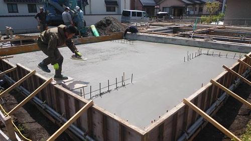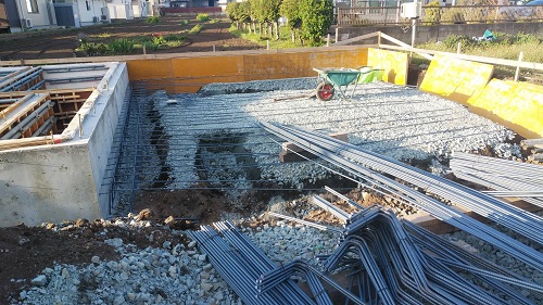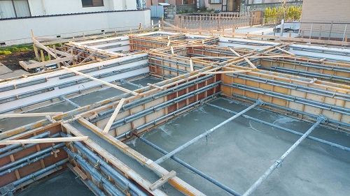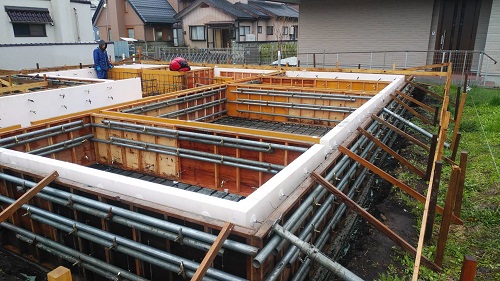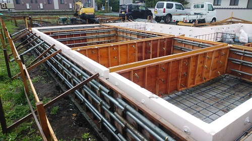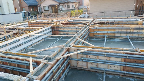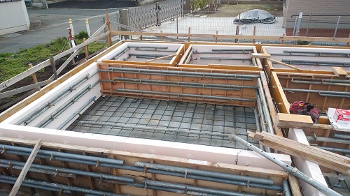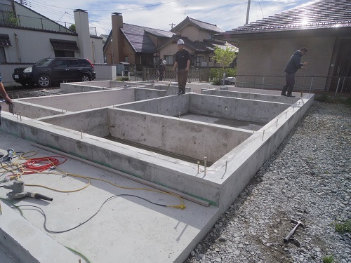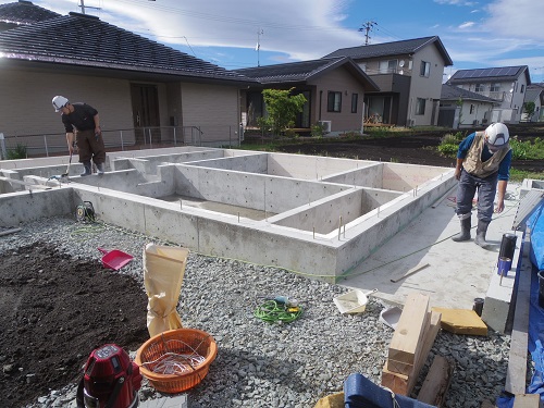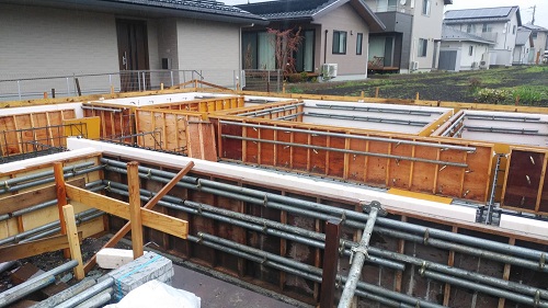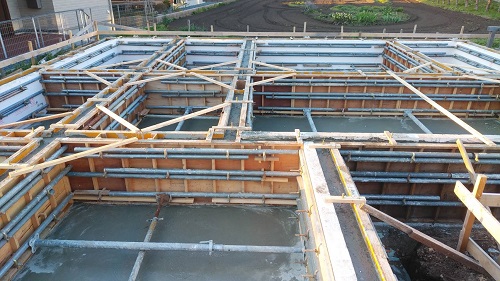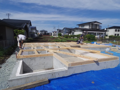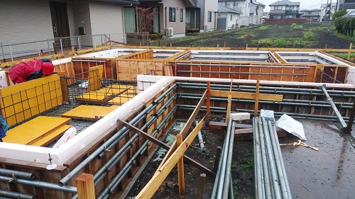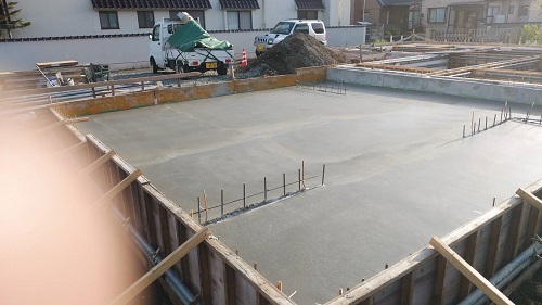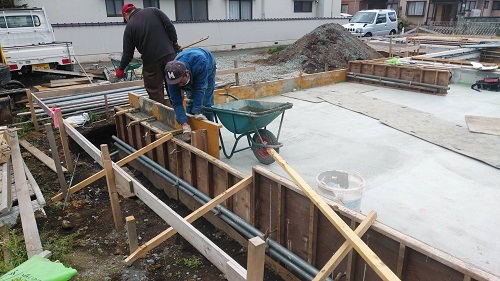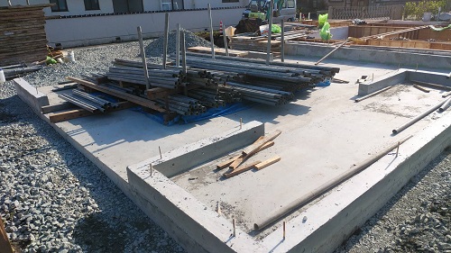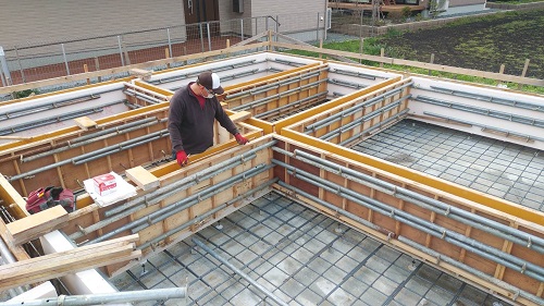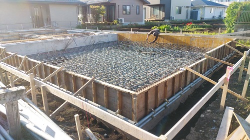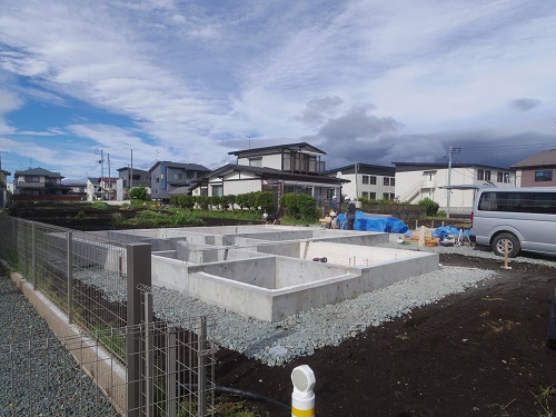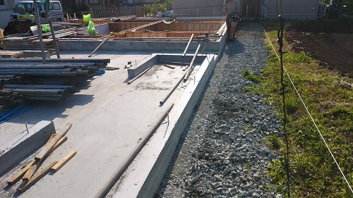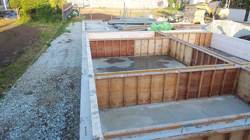 車庫の立ち上がり部のコンクリート打設しました。この後養生期間を設けて枠を外し整地が進む建て方工事へと進みます。