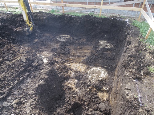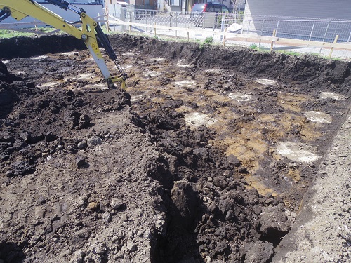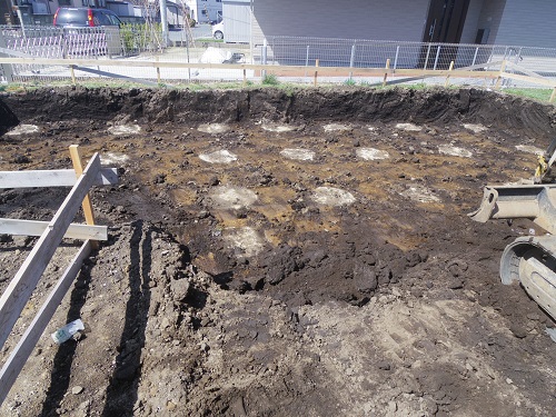 根伐りが進み土を掘り上げると地盤改良工事の柱頭が見えて来ました。