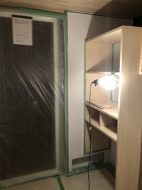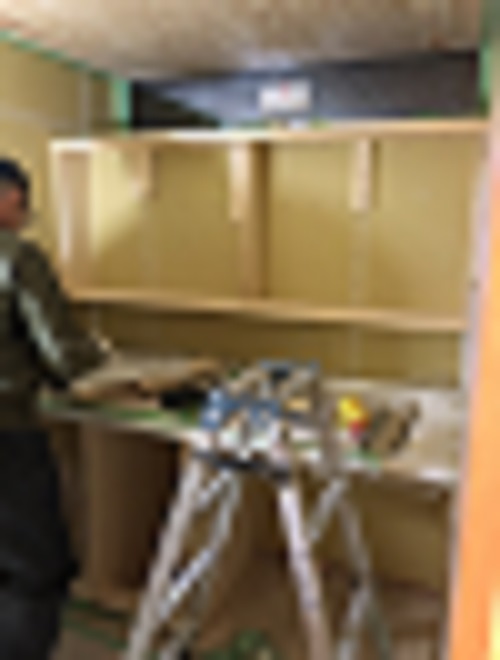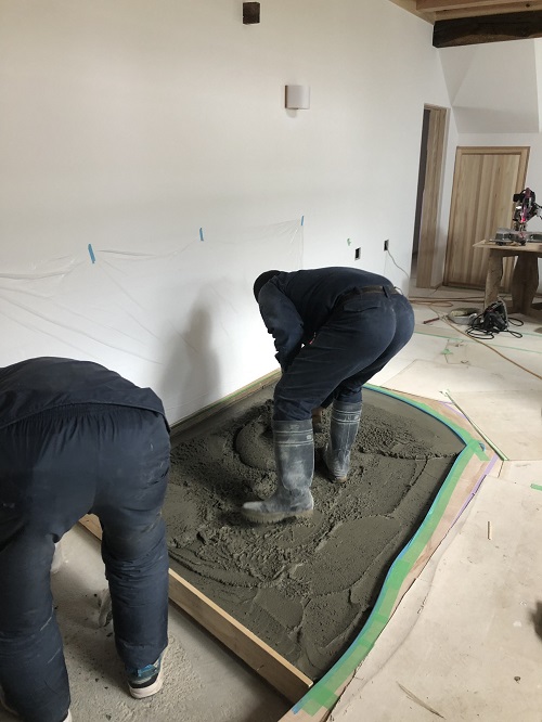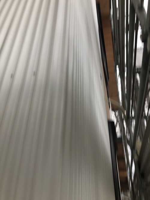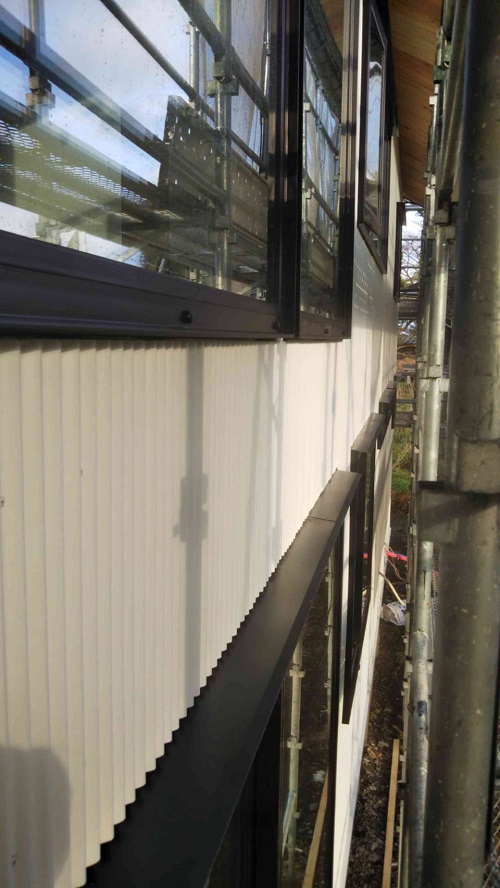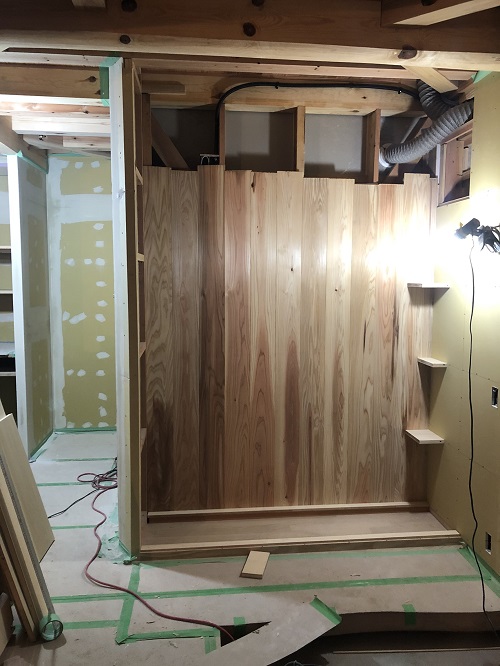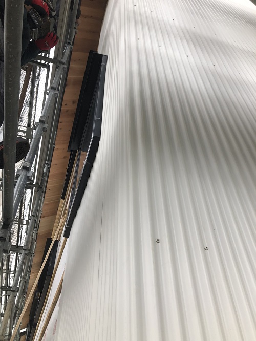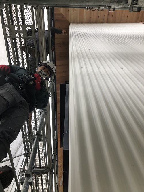 外壁の小波板張りが進み、薪ストーブの土間コン打設も進みました。