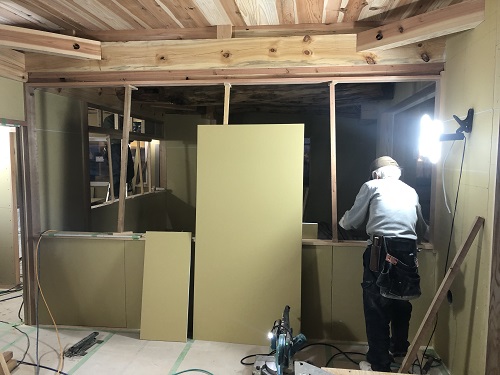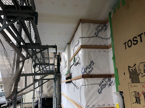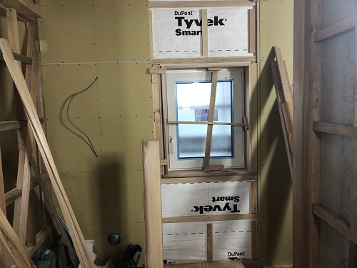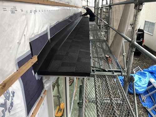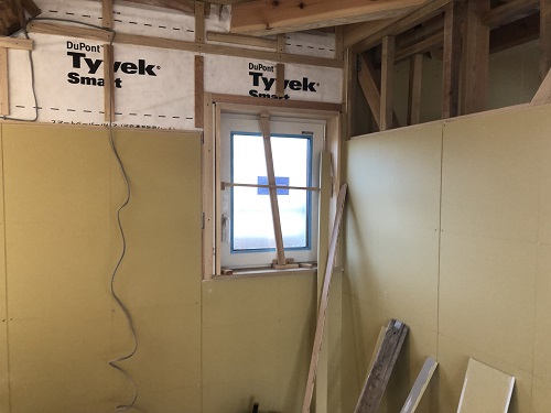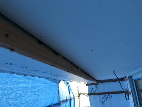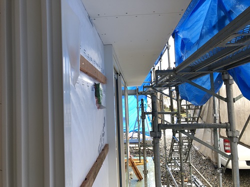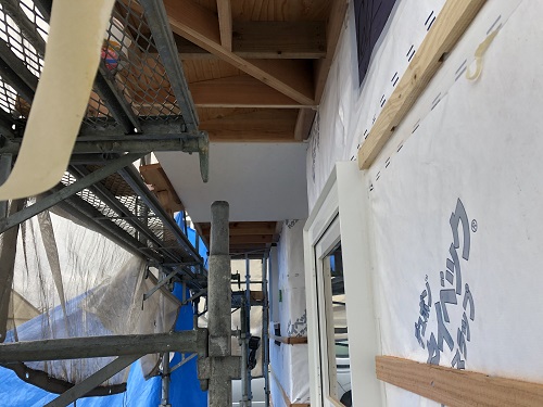 内部は防火構造PB張込みと共に、内装のパテ打ちも同時進行です。窓枠の取り付けも進み外部は庇の屋根葺きと外壁水切りを取り付けて外壁張りが始まります。