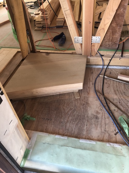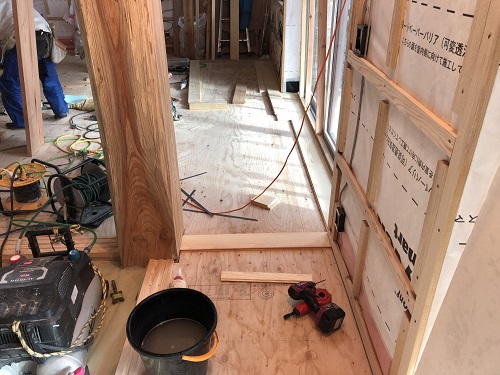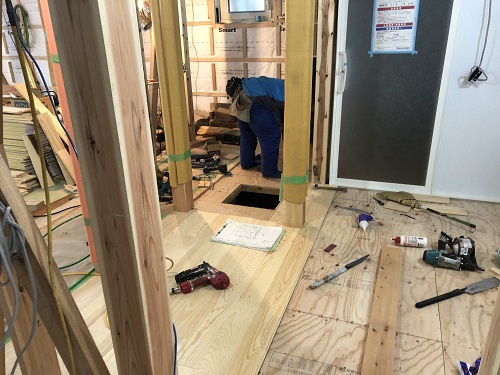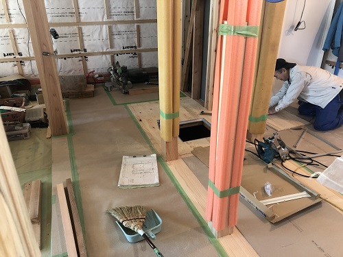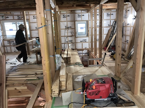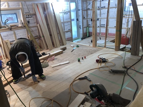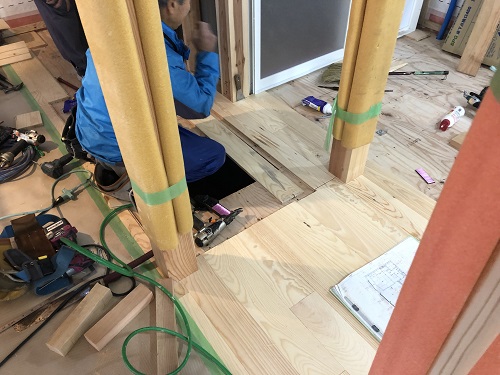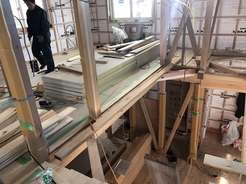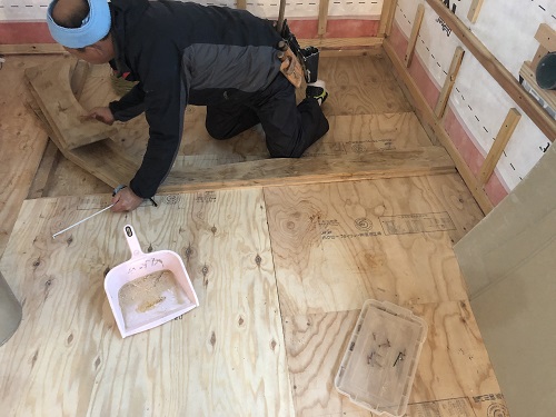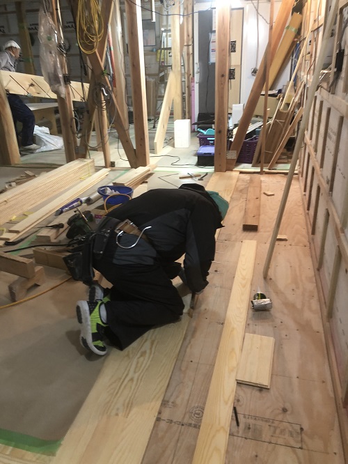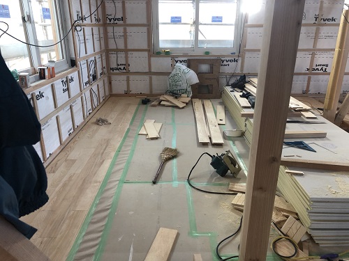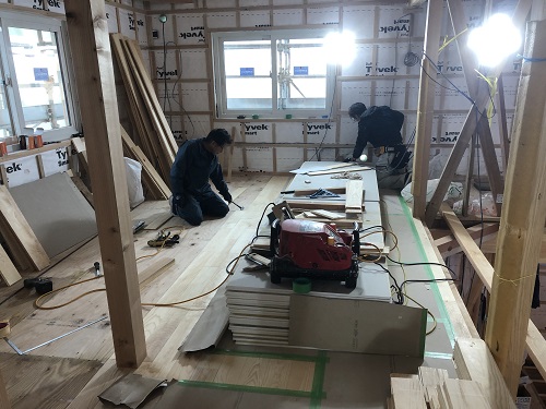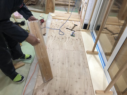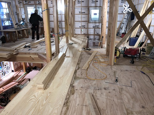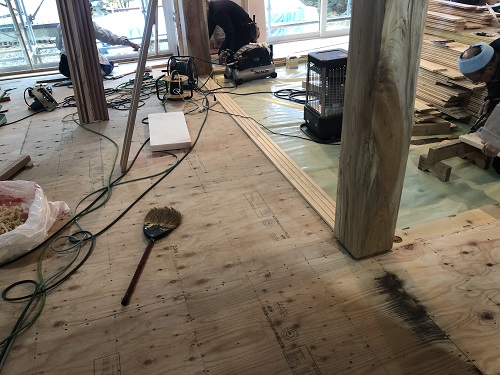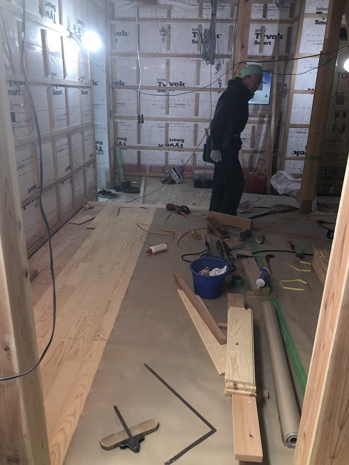 2階の床は張り上がりましたので、1階の床張り準備をしています。