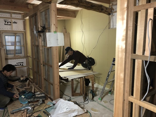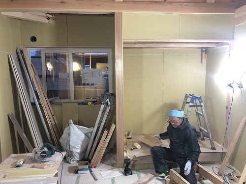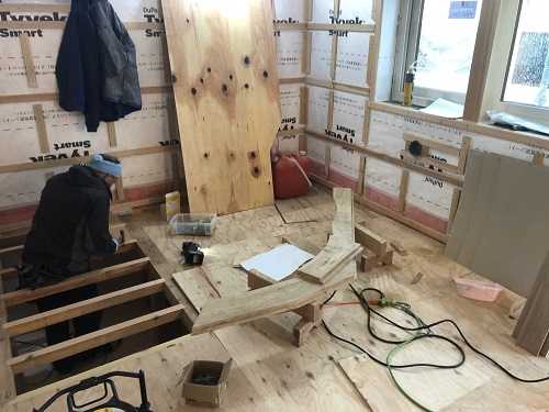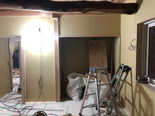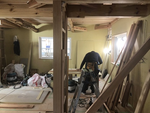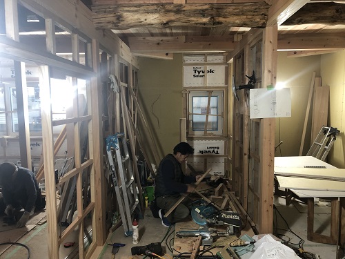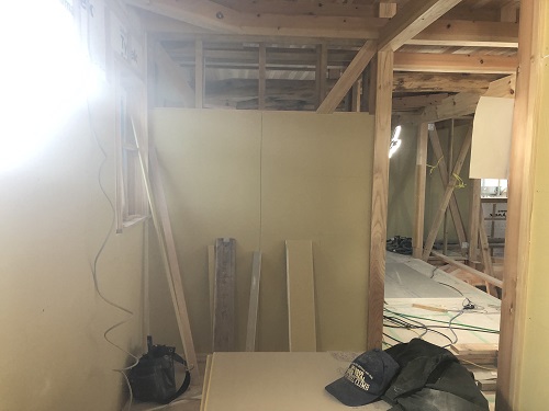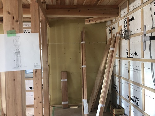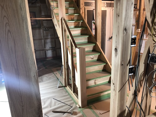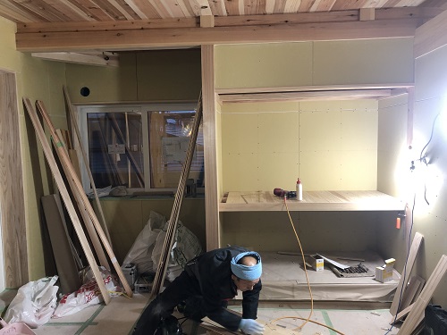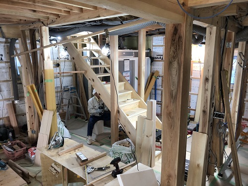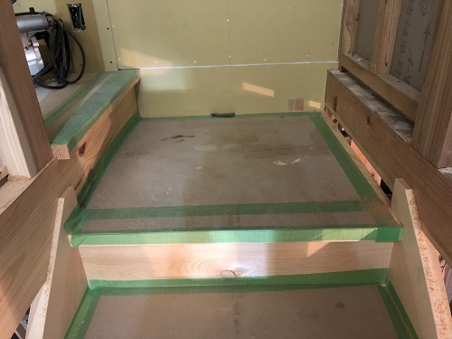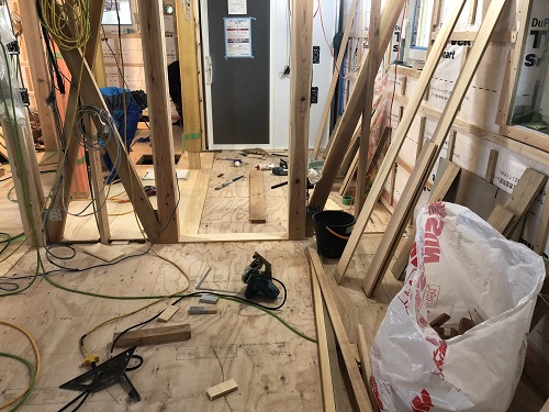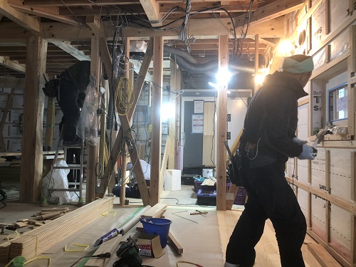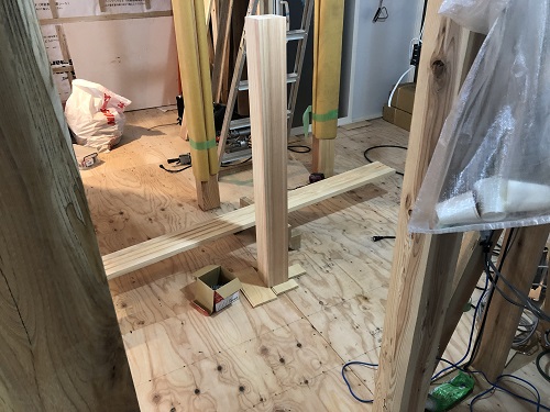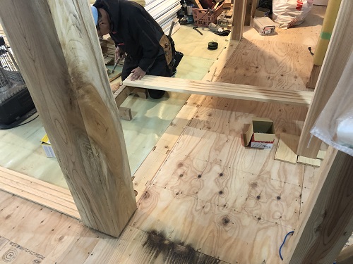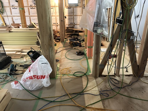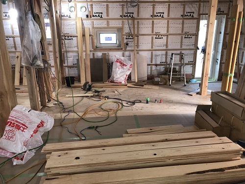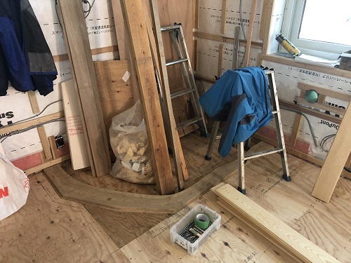 2階の床は張り上がりましたので、1階の床張り準備をしています。