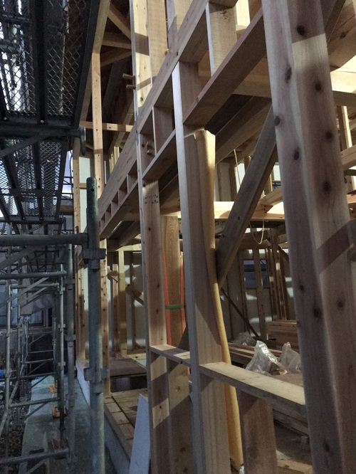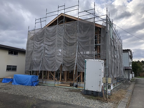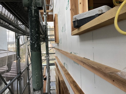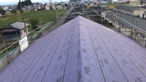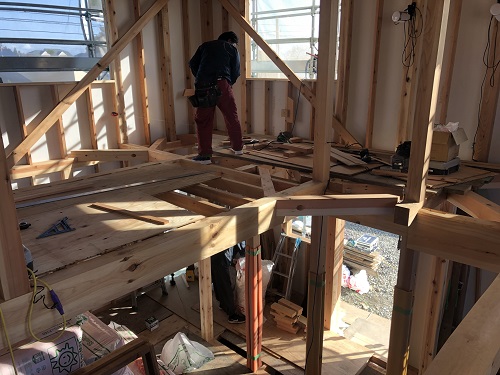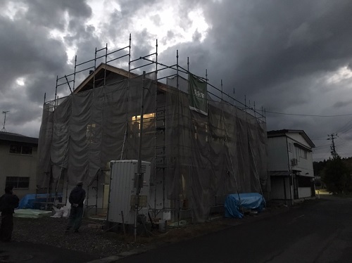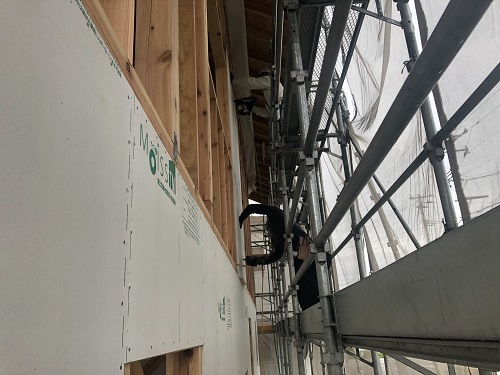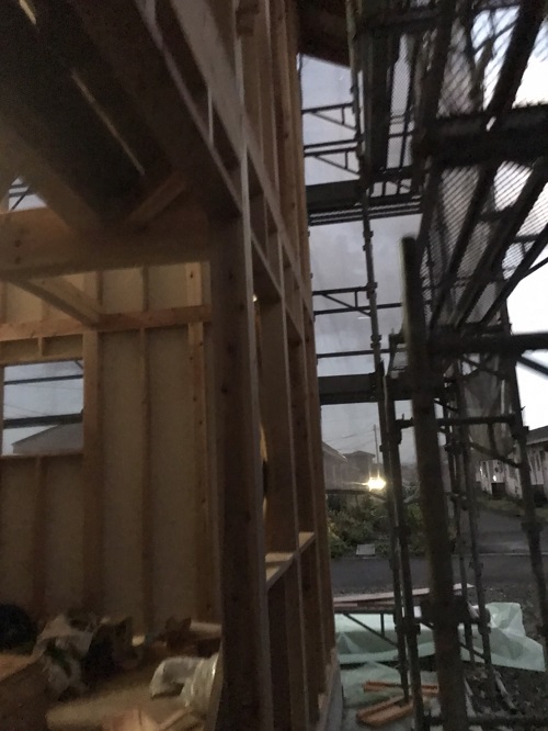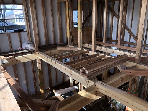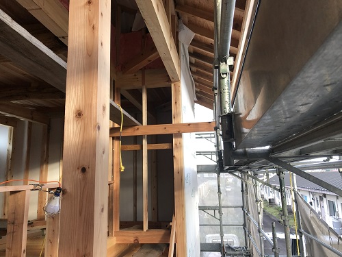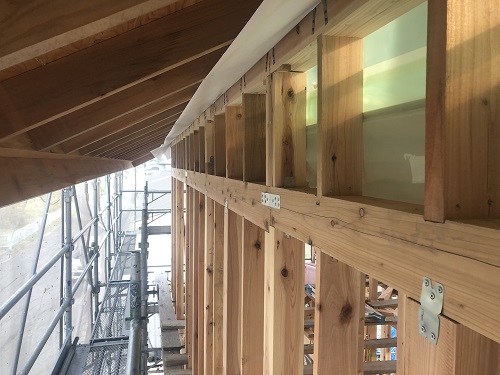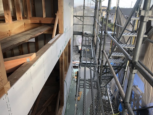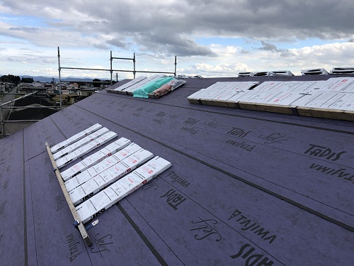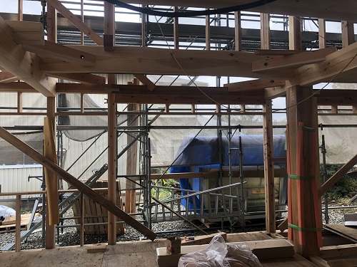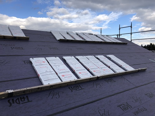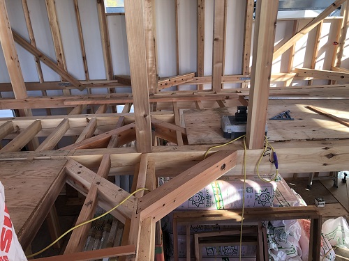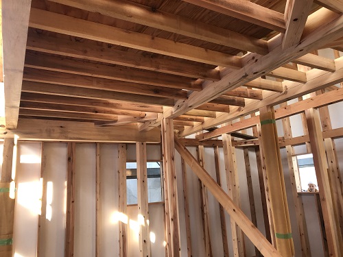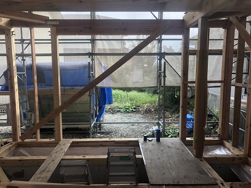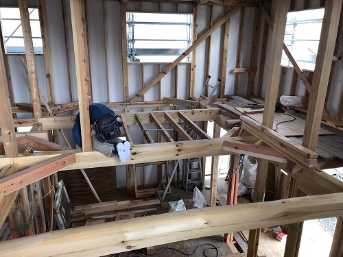 屋根葺き完了し、外断熱下地と2階床根太取り付けも進み出しました。