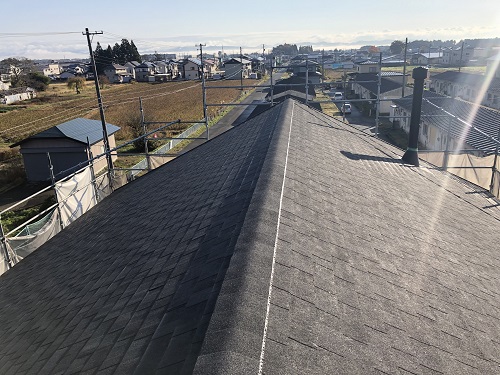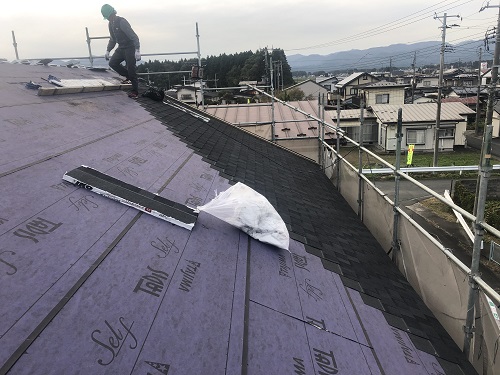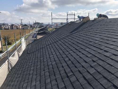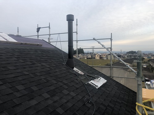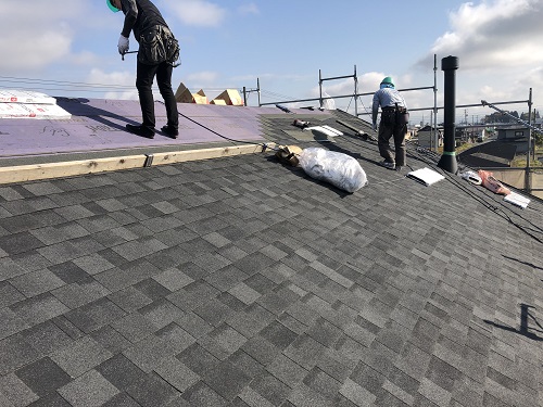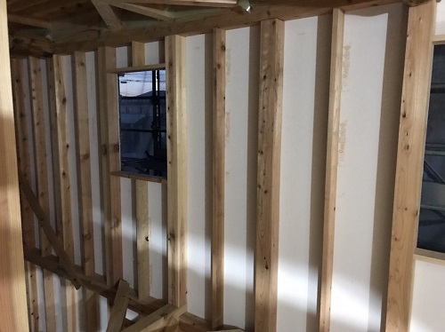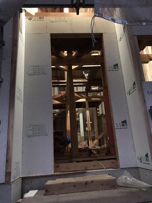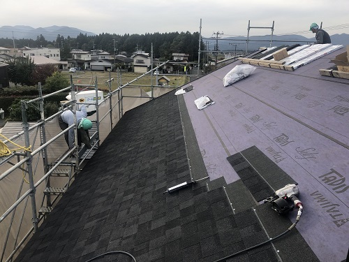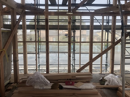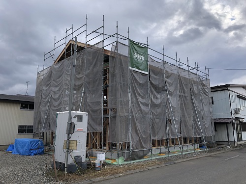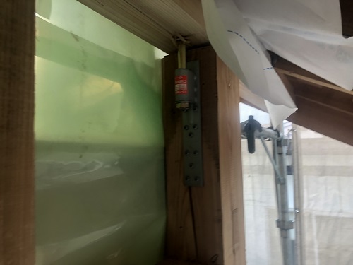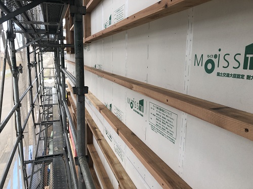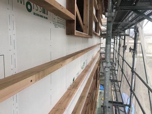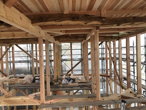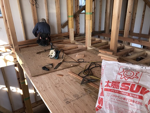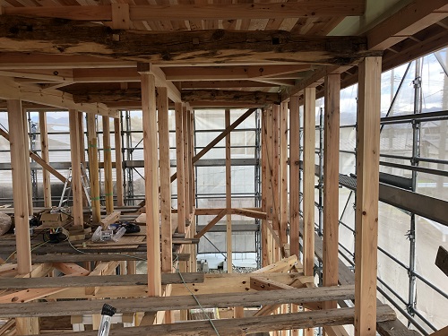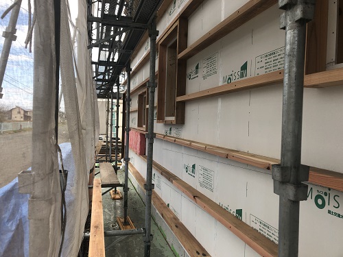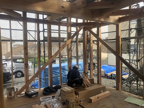 屋根葺き完了し、外断熱下地と2階床根太取り付けも進み出しました。