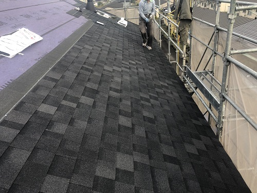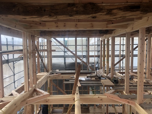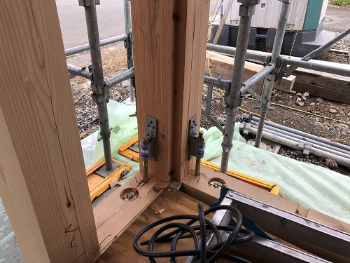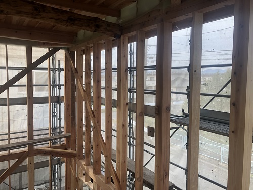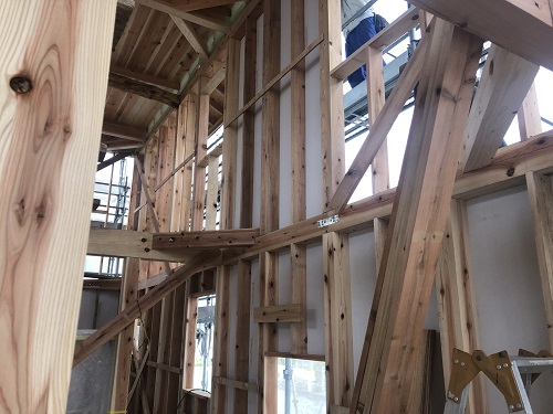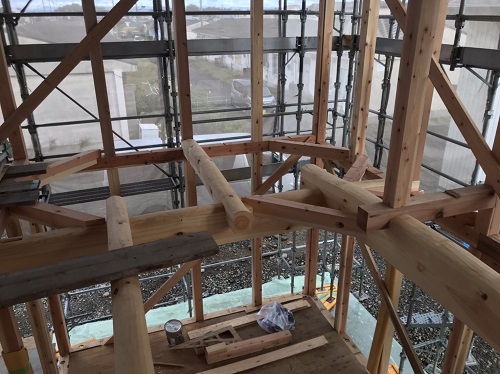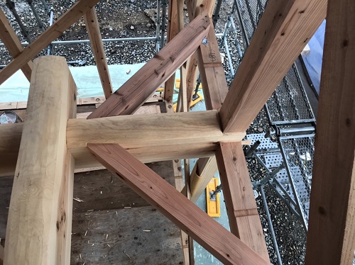 屋根工事が進み構造金物取付と外部間柱の入れ込みも進んでいます。