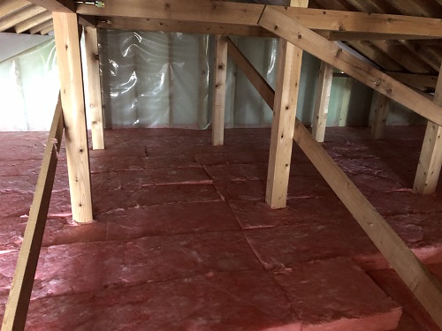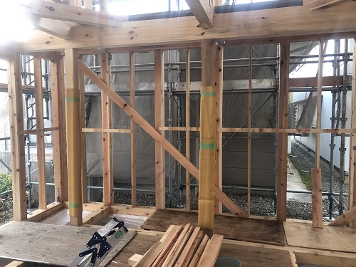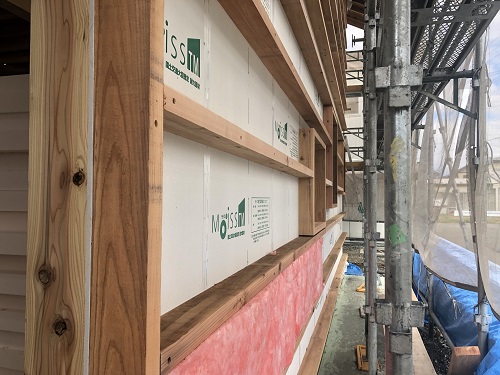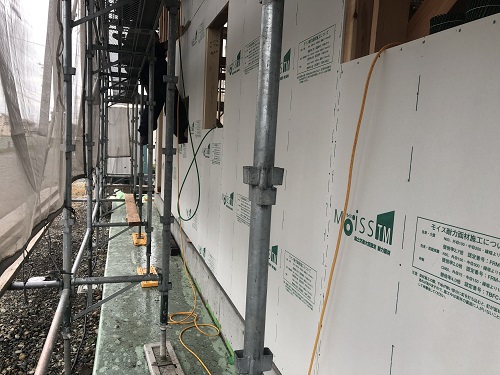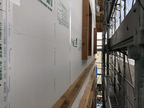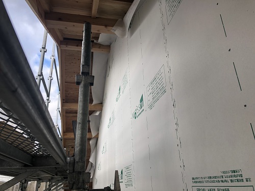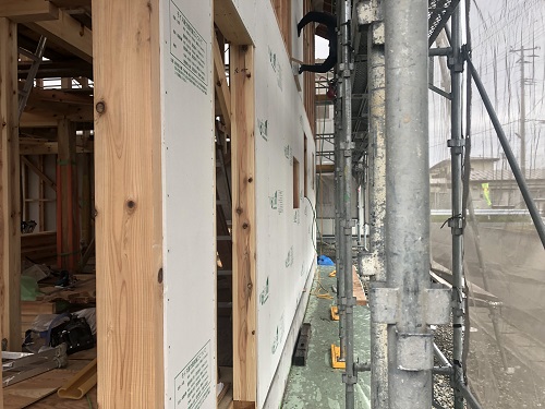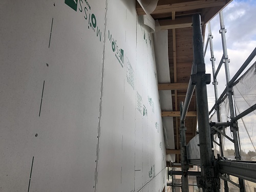 外壁の耐震構造面材の張込みと2階天井断熱が進みました。