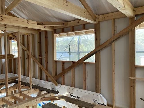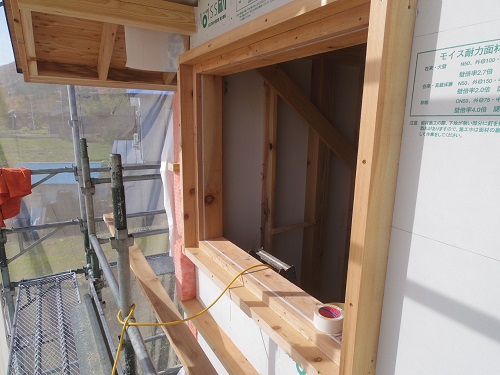 外部間柱取り付けが進み窓台の取り付けも進んでいます。