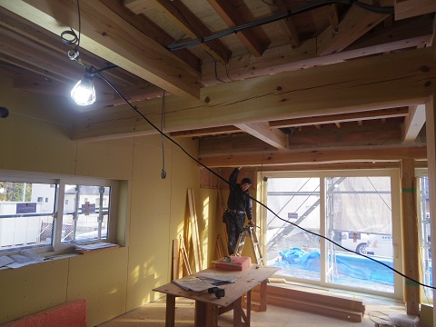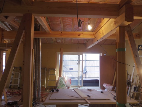 二枚橋の新築工事は、外壁工事が完了して、内部の大工造作が始まります。