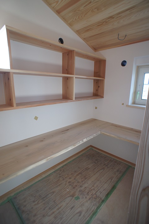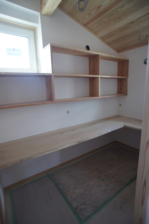細かな棚を取り付けられる前に内装の仕上げを進めると楽でいいのですが、仕上げたところを汚されてしまい、手直しが増えますから、ため息が聞こえてきそうなところはあるのですが、自社施工で家を造らせていただくのが、当社の良さの一つでもありますから、大工も多能工もみんなで共に、意識を一つに高めて頑張っています。