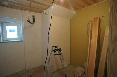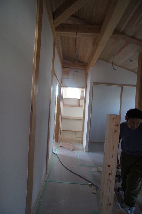 石膏ボードの張込みも進んで大工造作に手が届くところです。