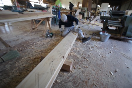 二枚橋の新築に向かう材料の加工が好摩で始まっています。松の敷居板の木取り中です。