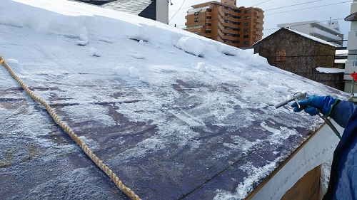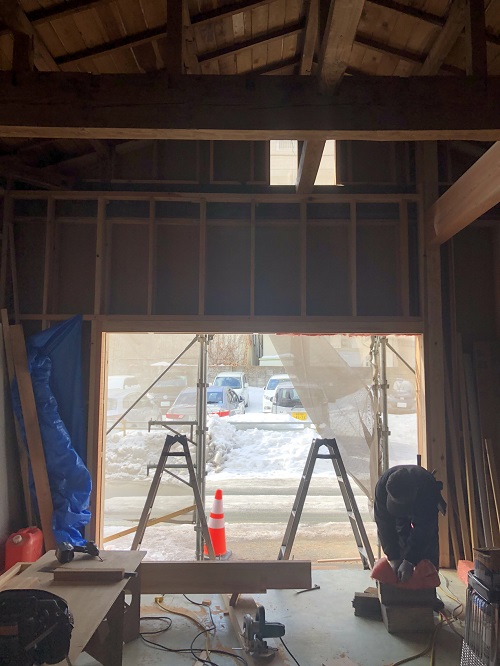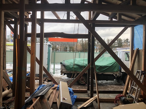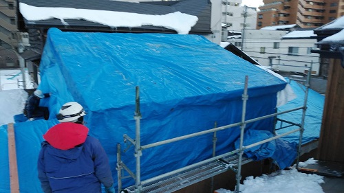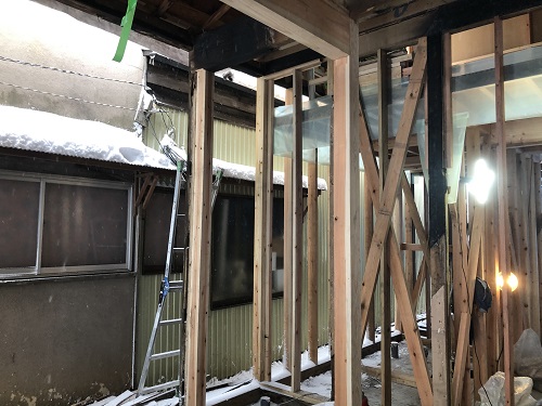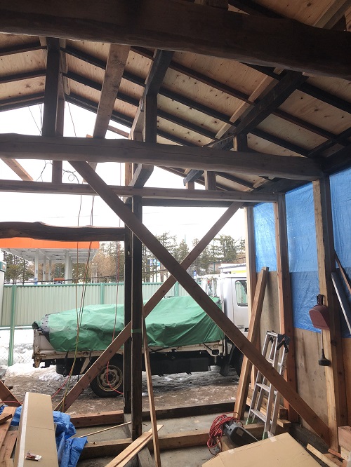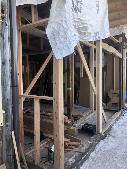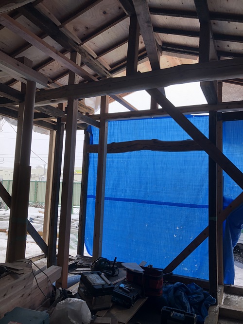 度重なる雪降ろしを行い、屋根工事を再開します。下階では外部工事の下地と構造補強が進んでいます。