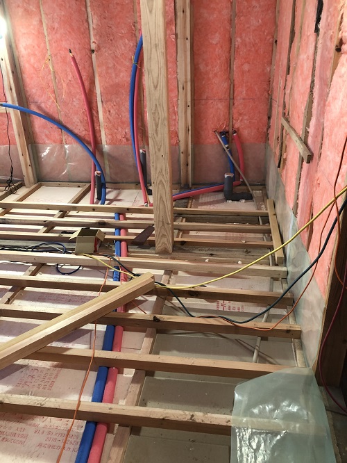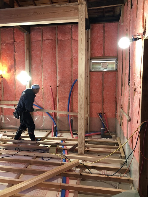 床下地がお進み、床を張り込む前に配管類が進められています。
