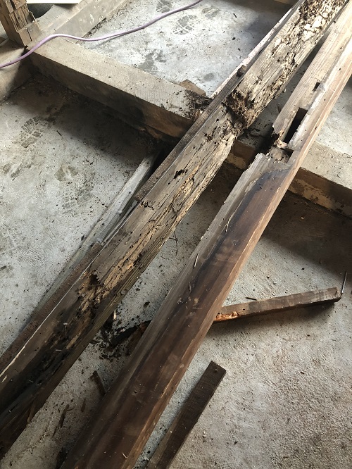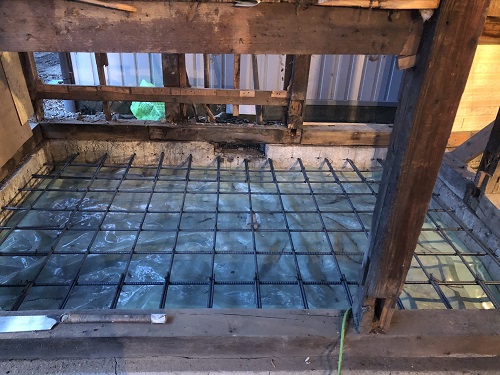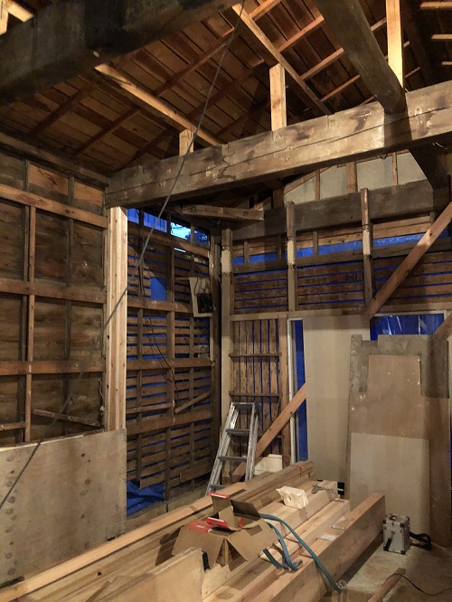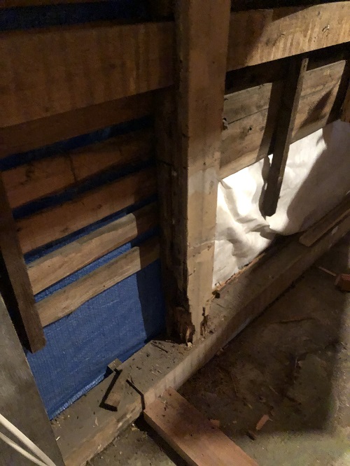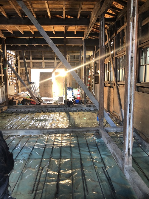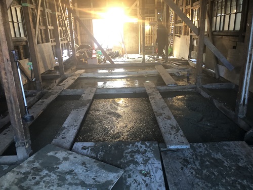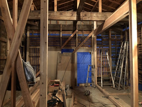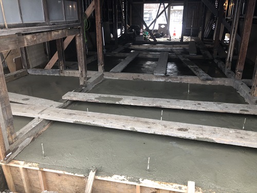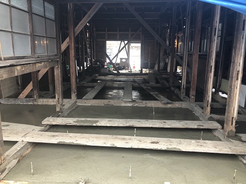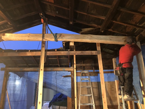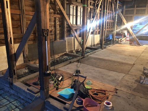 大改修工事は、基礎土間のコンクリートも乾いて来たので、木部の構造補強及び補修に取り組み始めています。