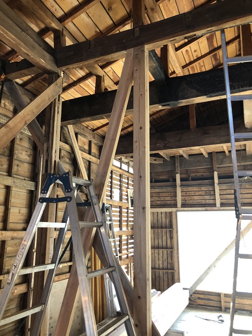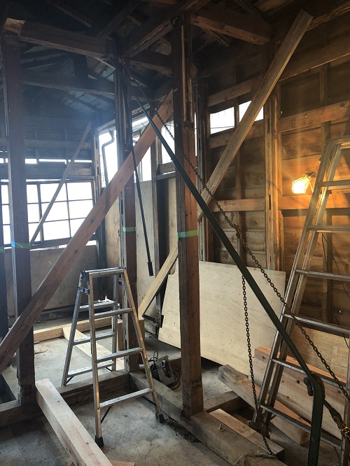 建物の歪みと倒れを修繕しています。こうして直せるのも木造軸組み構造ならではです。