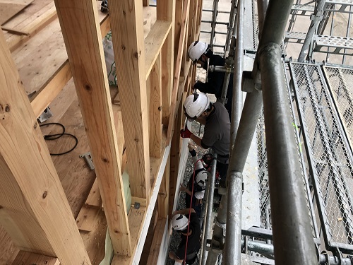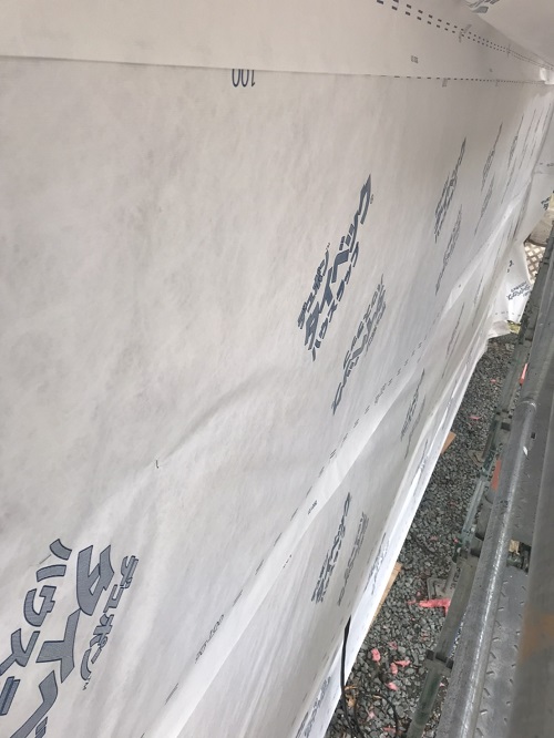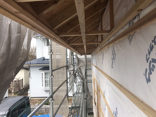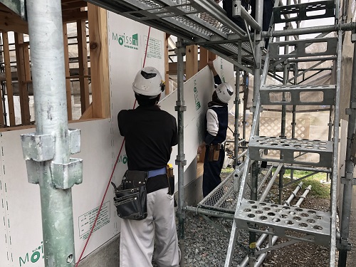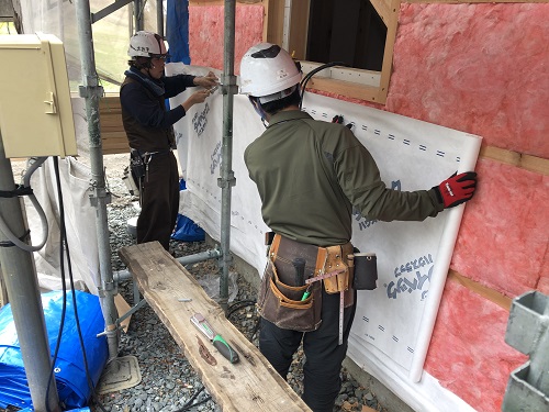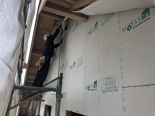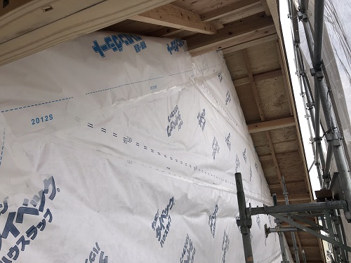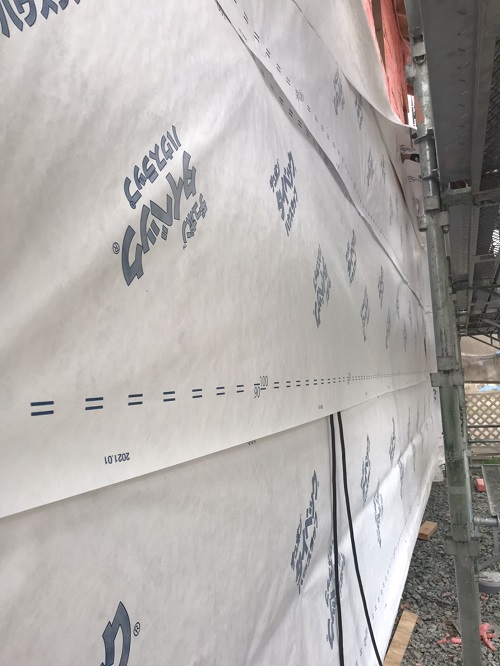 外断熱と透湿防水シート張りが進みました。