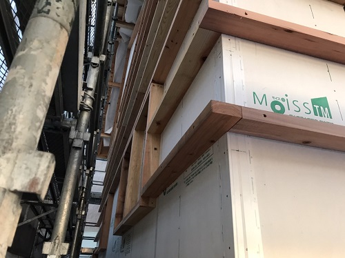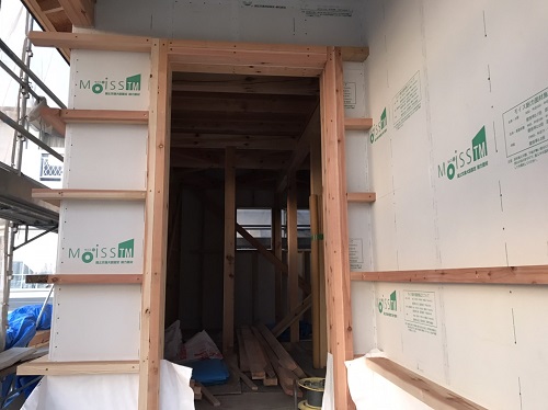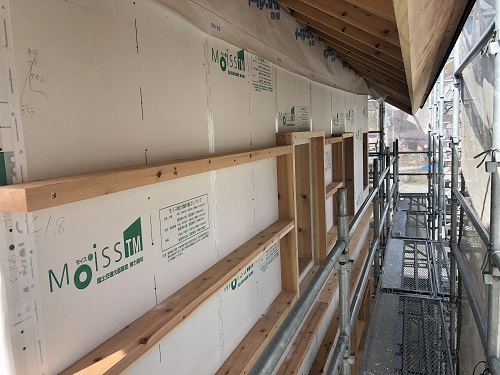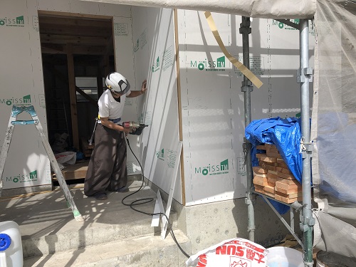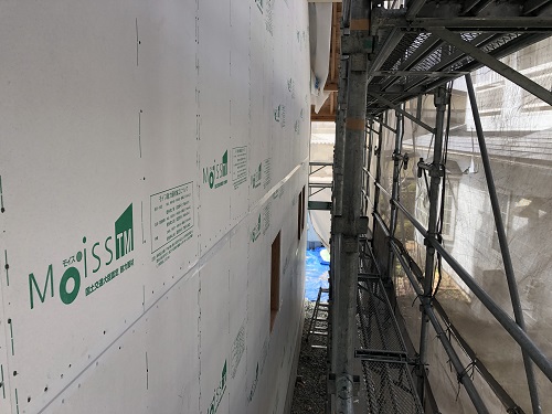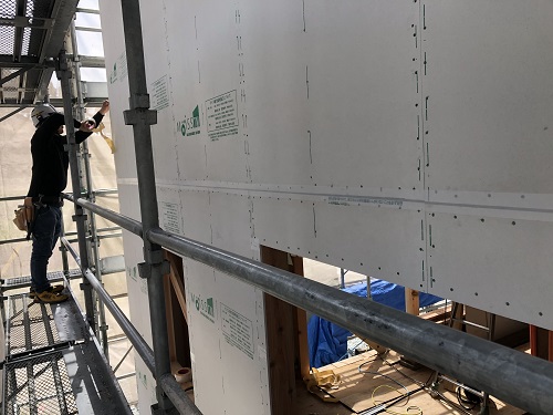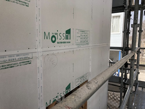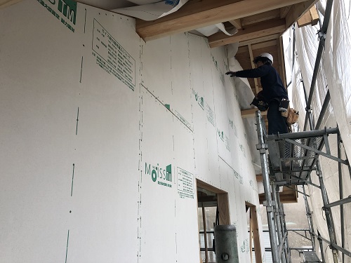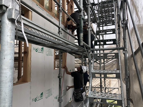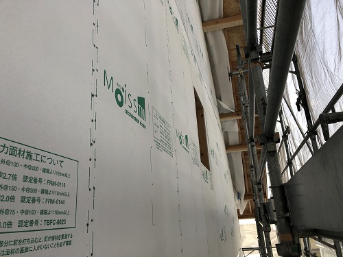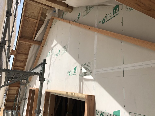 構造面材と防火構造面材を兼ねるモイスの張込みが進みました。チームワークの連携で二日で全面張り上げれそうです。