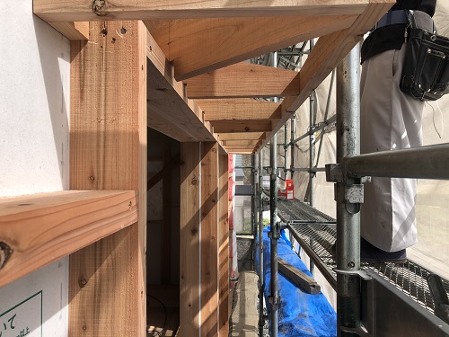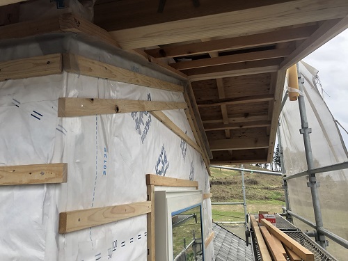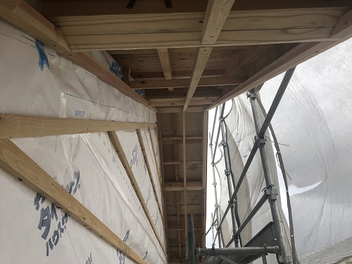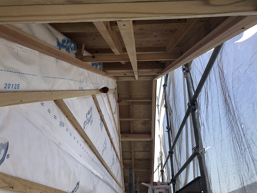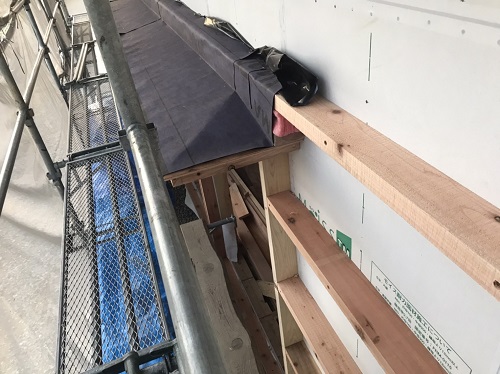 引き続きのタイベックシート張りと庇の取り付け並びにサッシ取り付け準備が進みました。