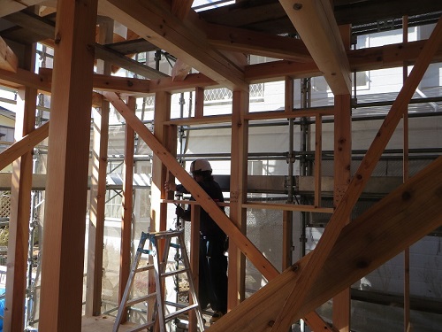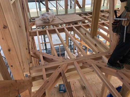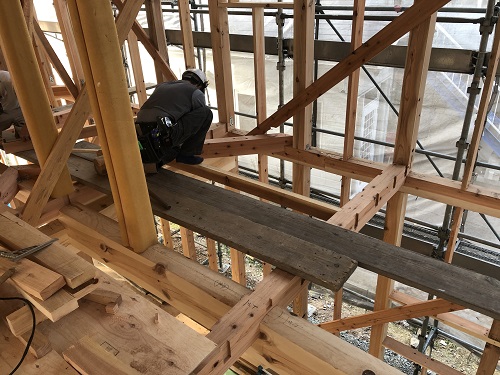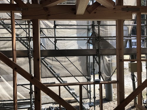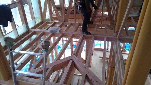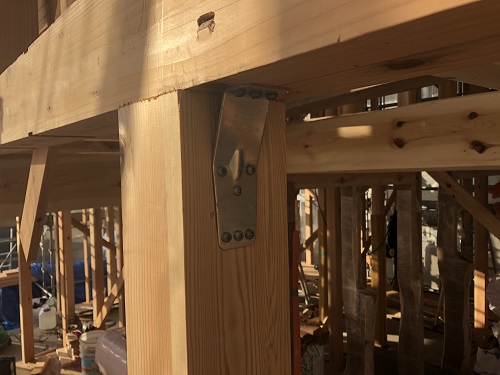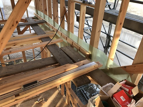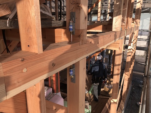 構造金物の取り付けが完了したので、2階の床根太を先に取り付けて、足場を良くしようとしています。