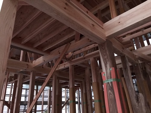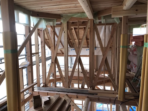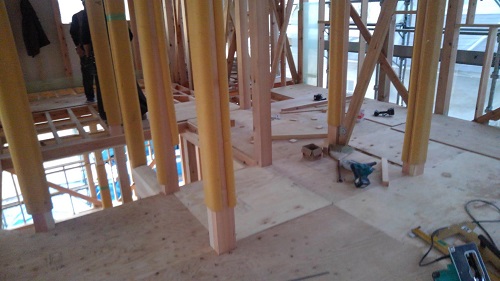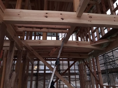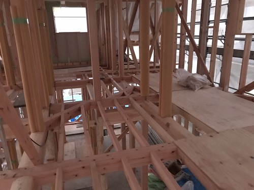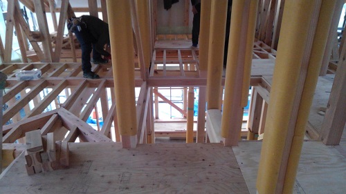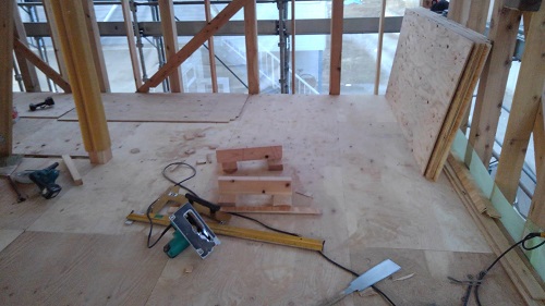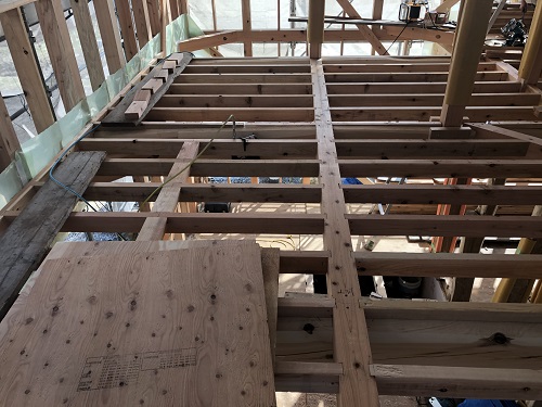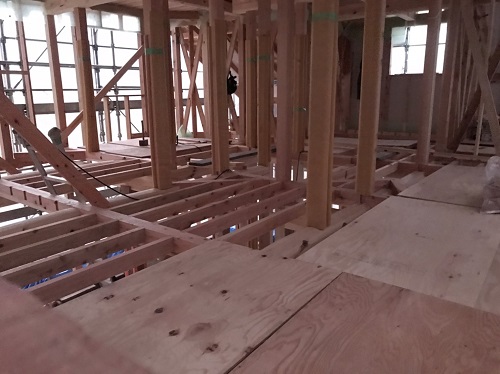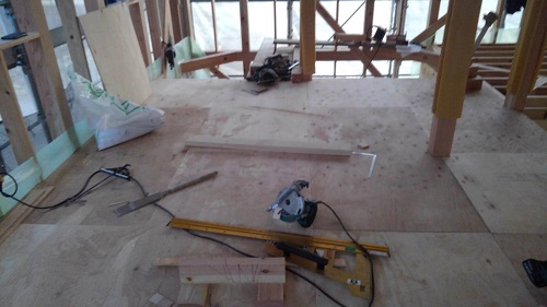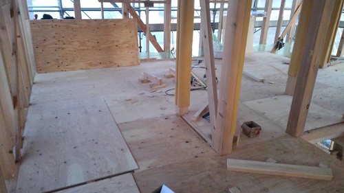 先週末で2階の床下地合板の敷き込みが進みました。水平剛性材となります。