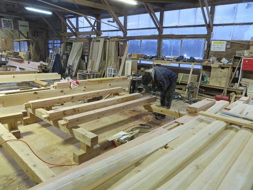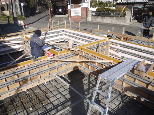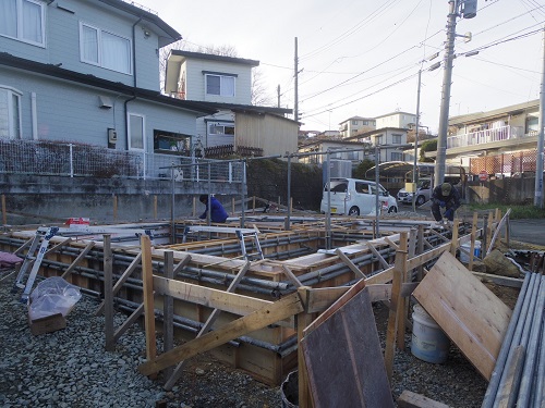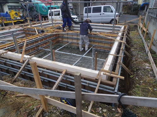 水道の引き込み工事が進み今日は車庫部の基礎コンクリートを打設しています。刻みも完了して、年明けの建て方準備が出来ました。