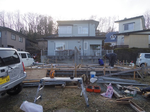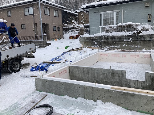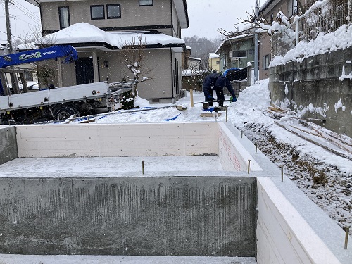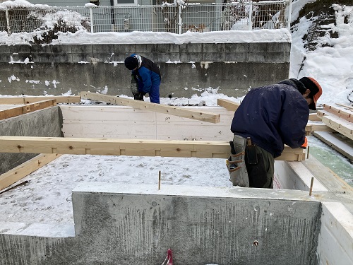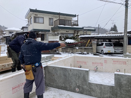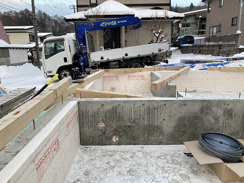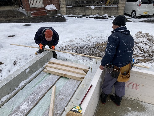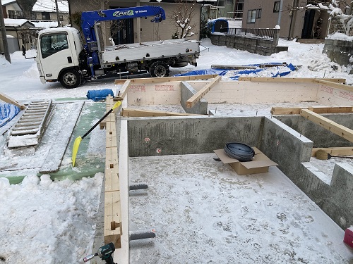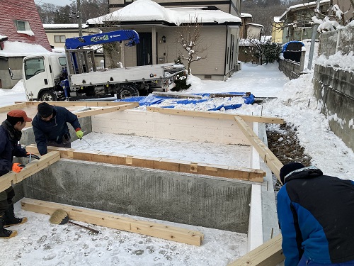 年明けは、除雪作業からですが、基礎枠を外して土台敷き込み準備をしています。