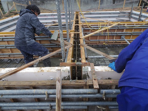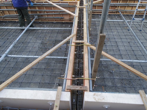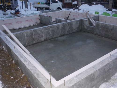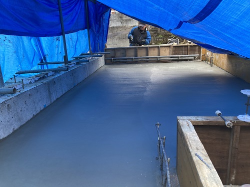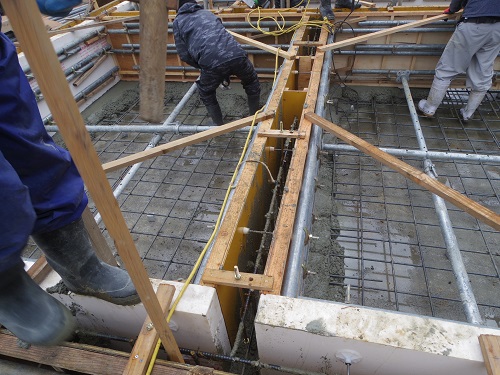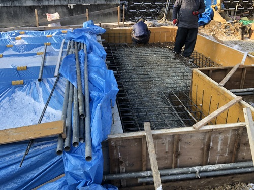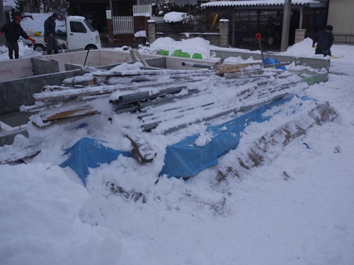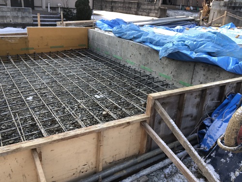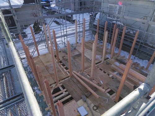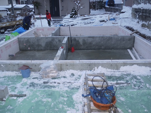 コンクリート打設後の基礎の状況です。雪対策の屋根が夜間の凍結防止の囲いとなり、暖房を焚き込んで温めました。その内部は20度を下回らない温度管理です。