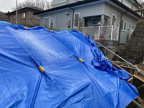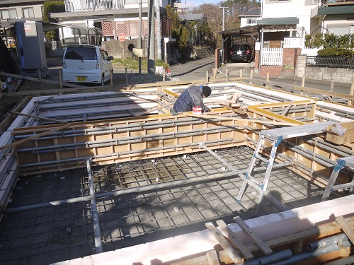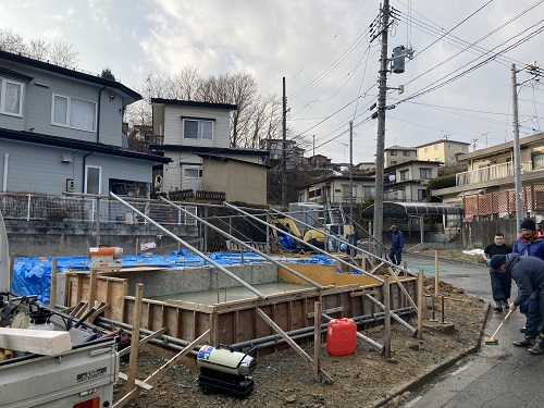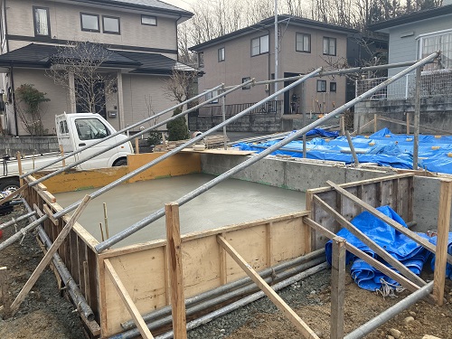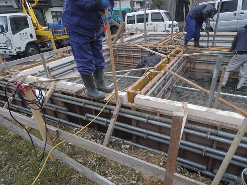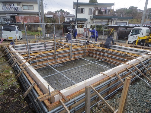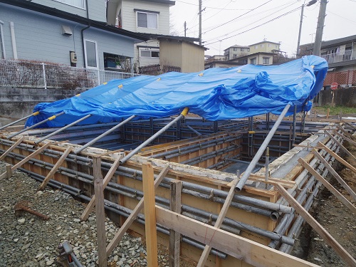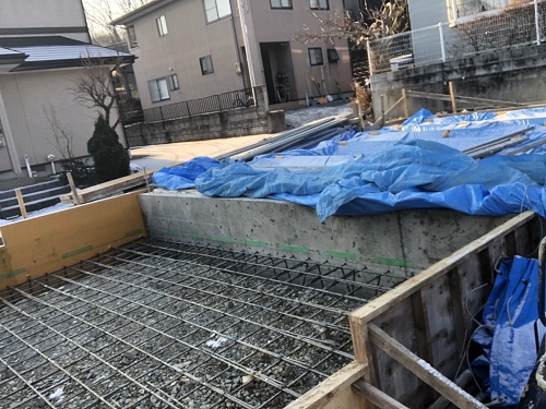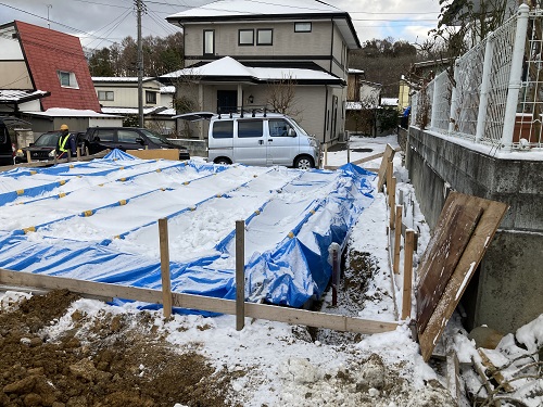 車庫のコンクリートを打設養生して年越しの基礎現場です。暑い時も寒い時も外仕事は本当に大変なのです。私も基礎工事を自ら直接行っていたことも有るので、その大変さが良く分かります。皆が本当に良く頑張ってくれていますので、感謝です。家は、こうして人の手で造り上げられていくので、そこに大切に養生しようとの心が籠って優しく強い住まいが出来て行くのだと思います。
