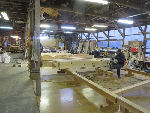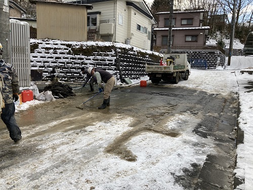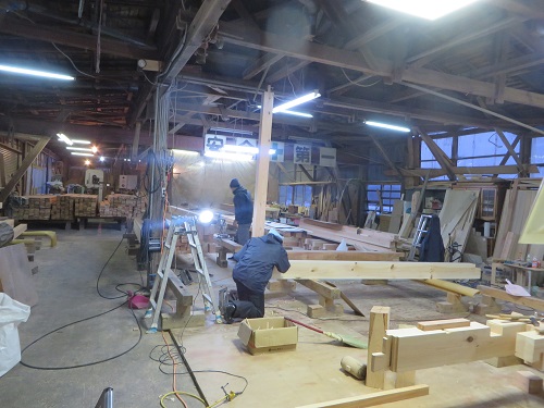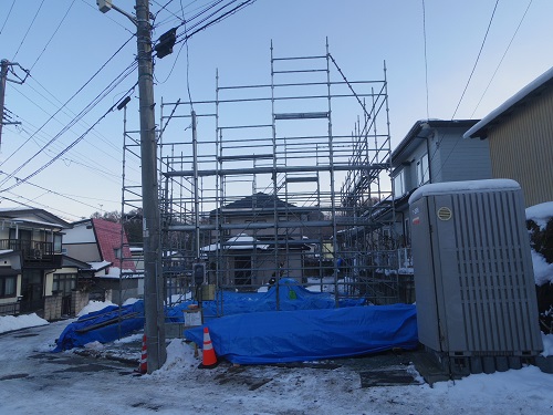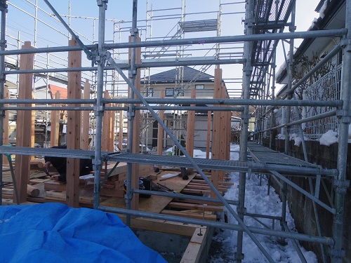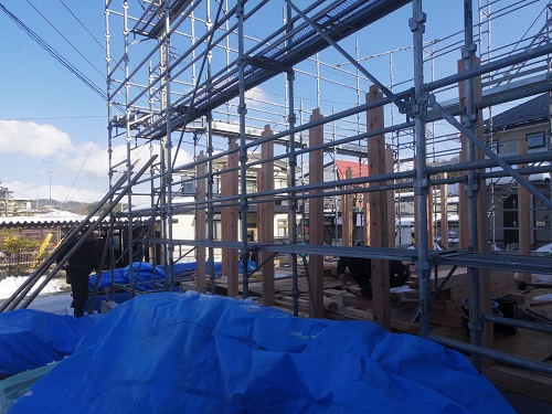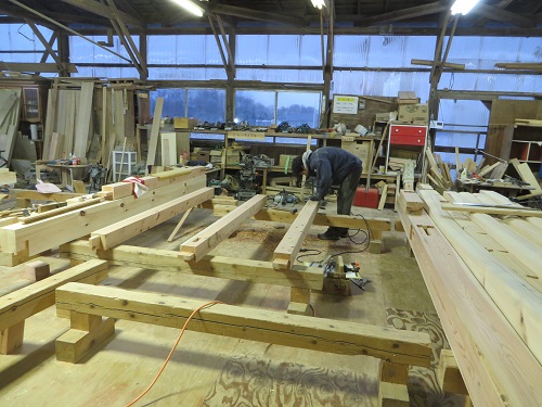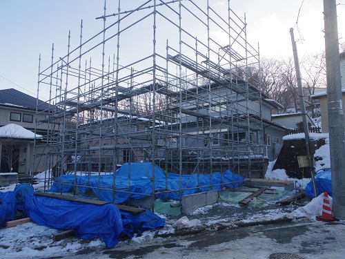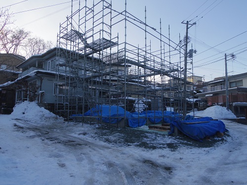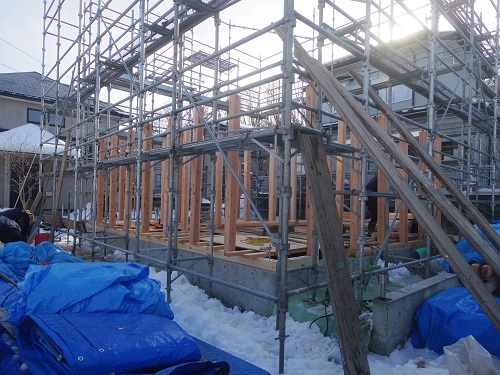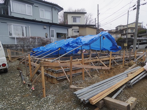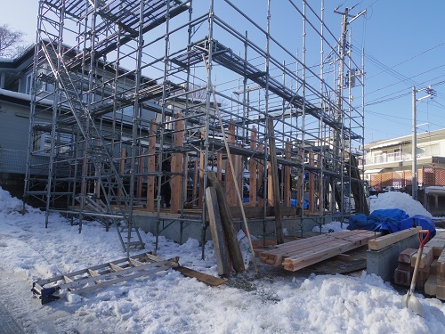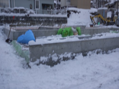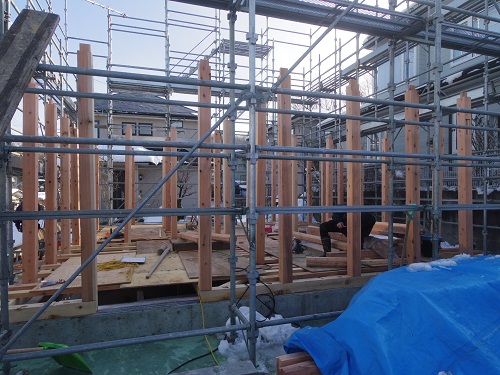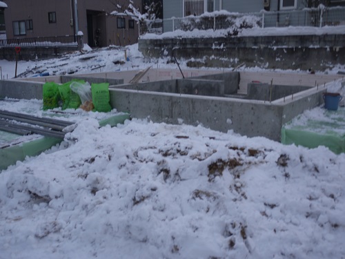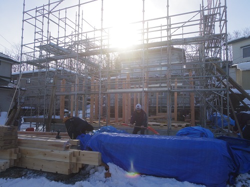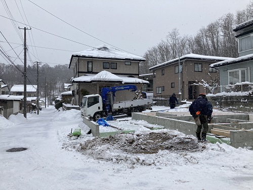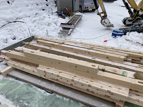 土台の敷き込みが始まりましたが、外周部の整地の方がまだ雪の為手こずっています。特に整地用の土が凍り付いてしまいなんともなりません・・・