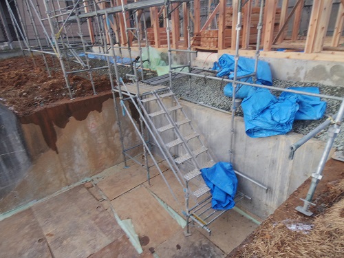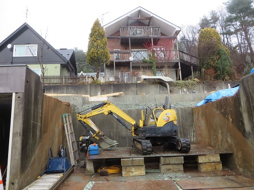 生憎の雨ですが、外周部の整地を終えて、土台の敷き込みを開始しました。明日は足場の予定です。