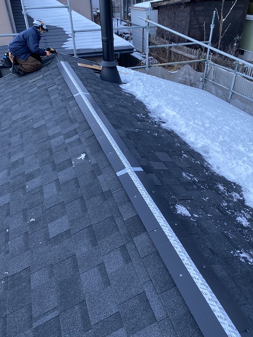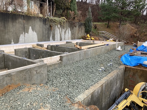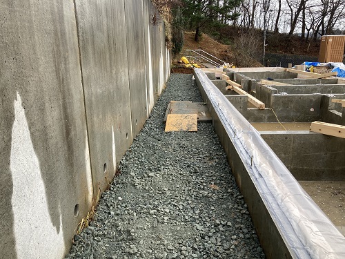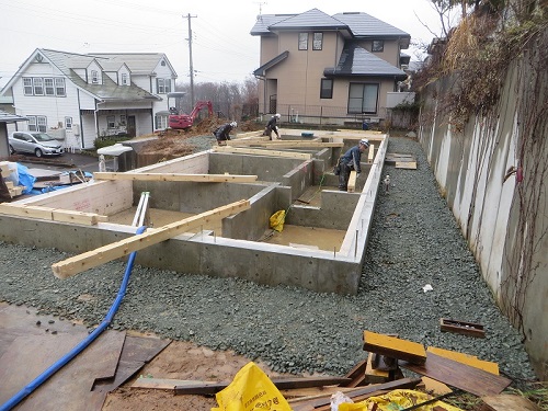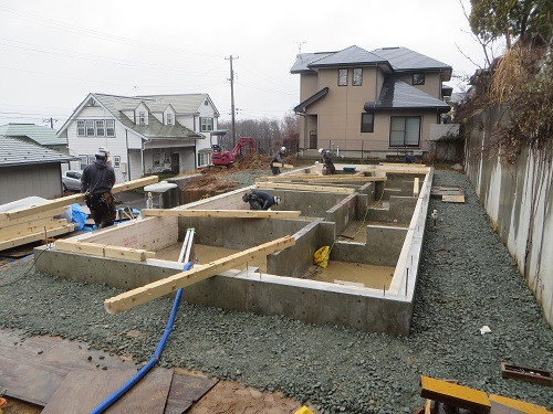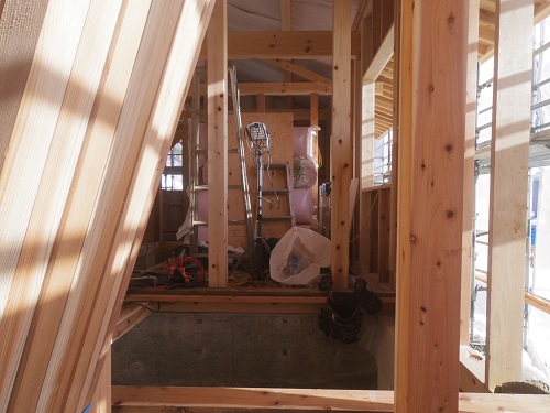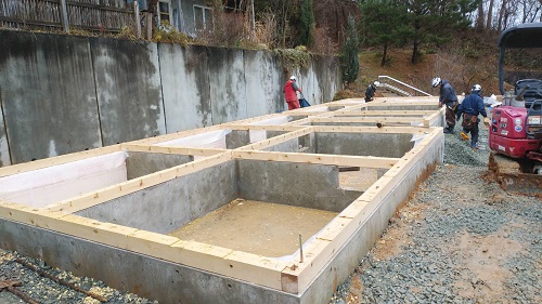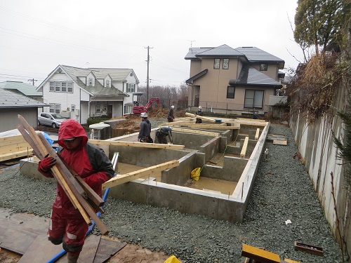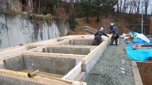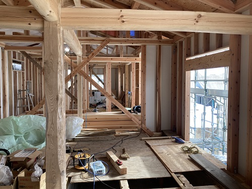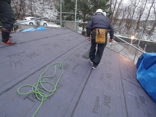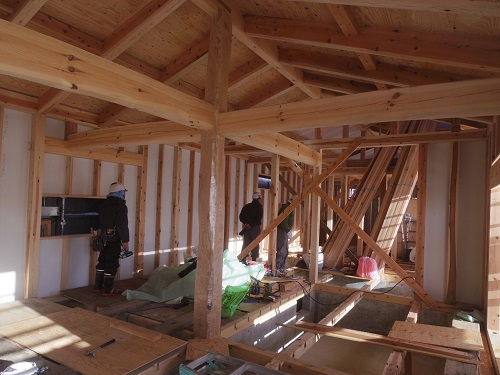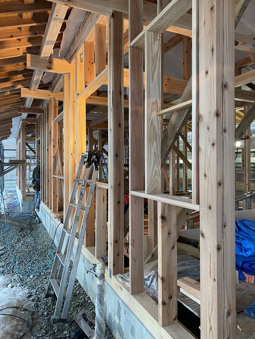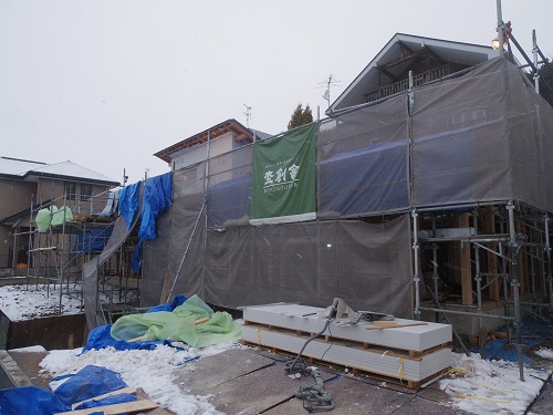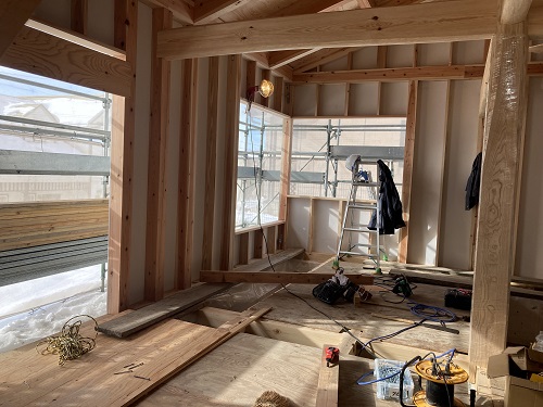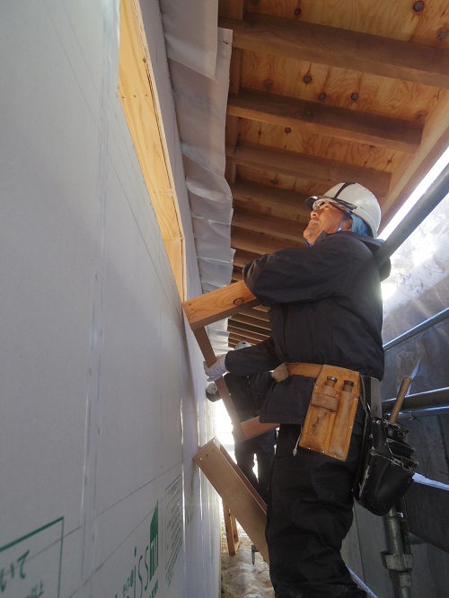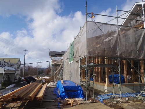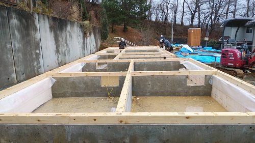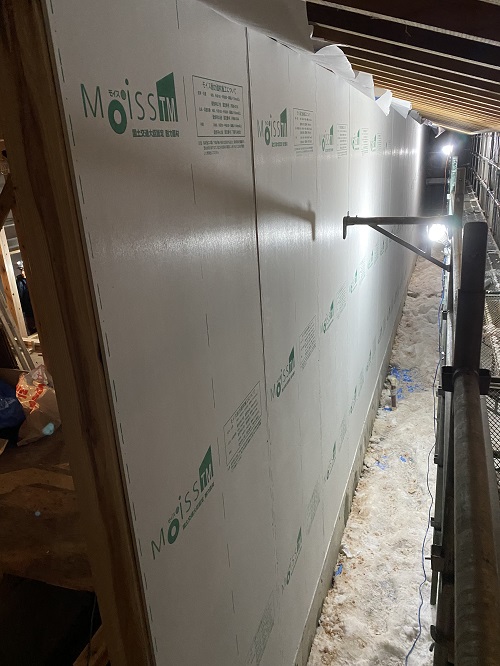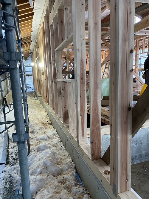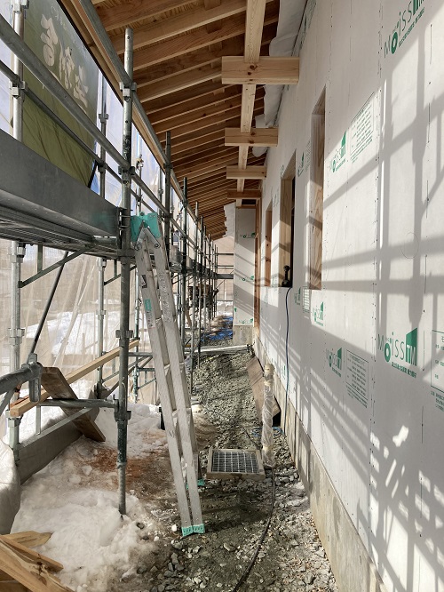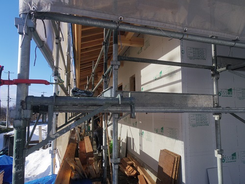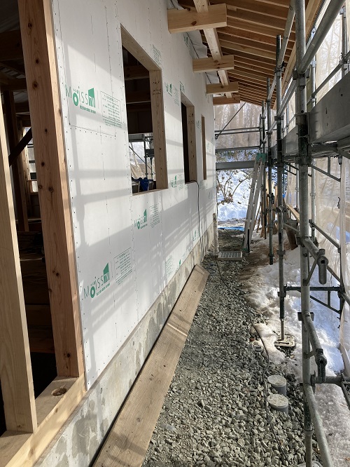 休み明けは、休み前に吹き込んだ雪が土間コンクリートで凍り付いていたので、それを溶かして床下地組をしています。外部の外断熱下地工事も進めていました。