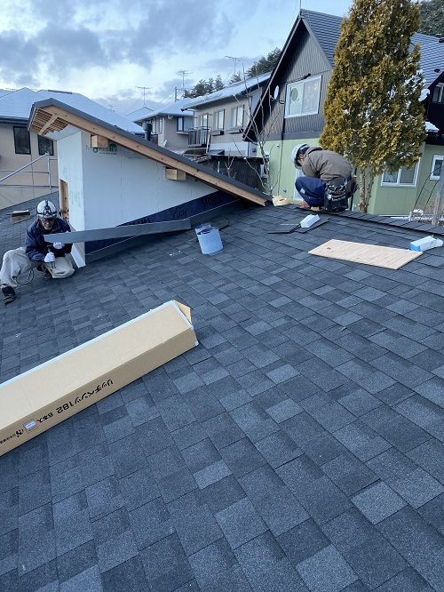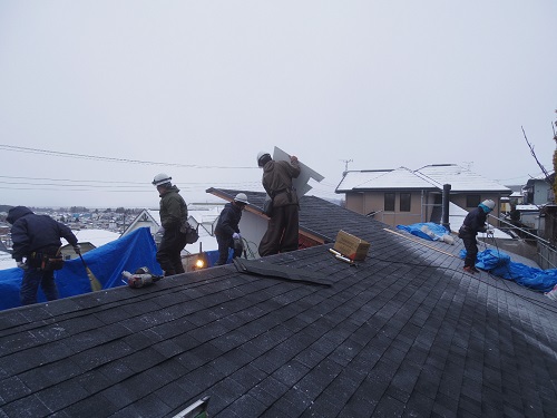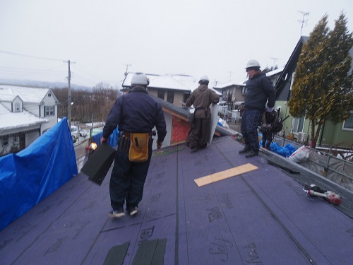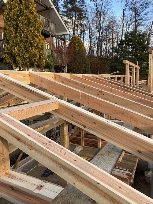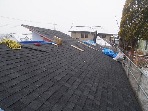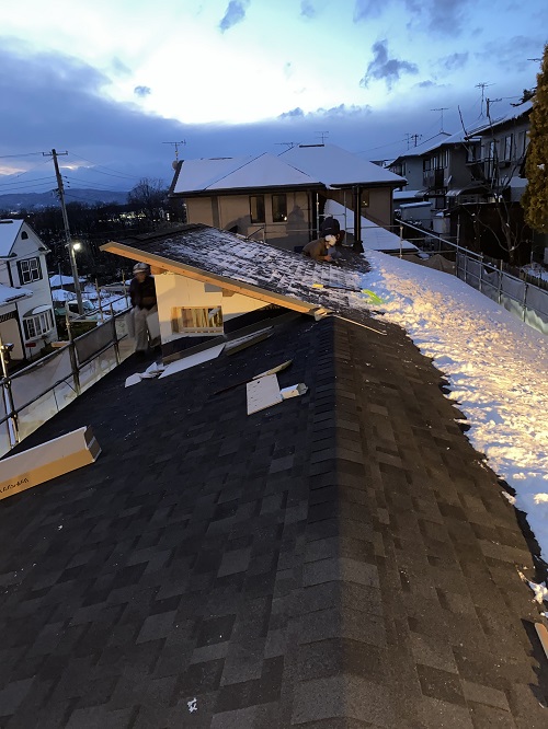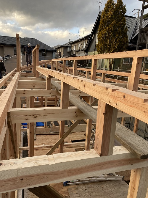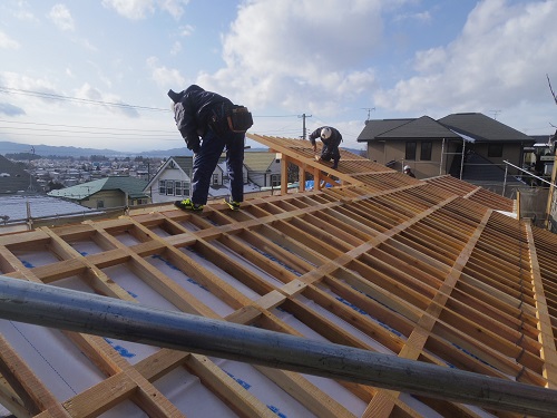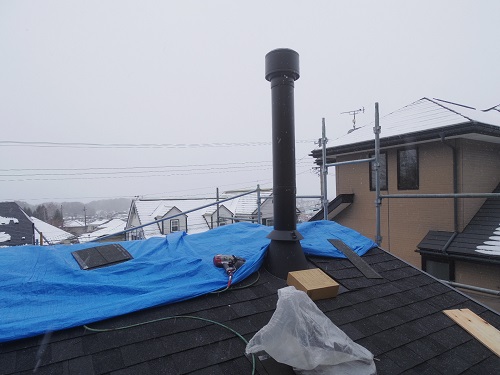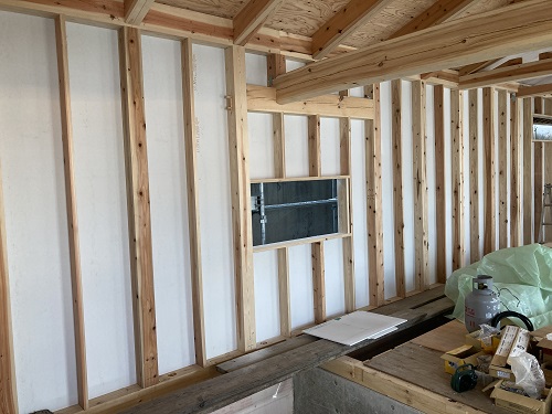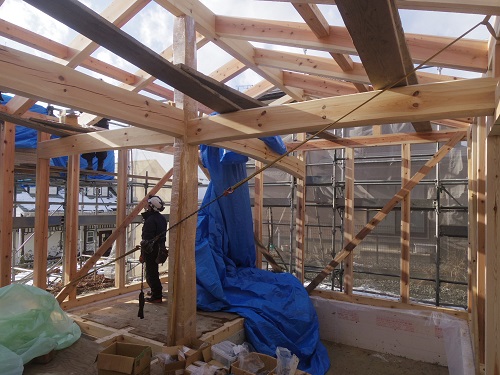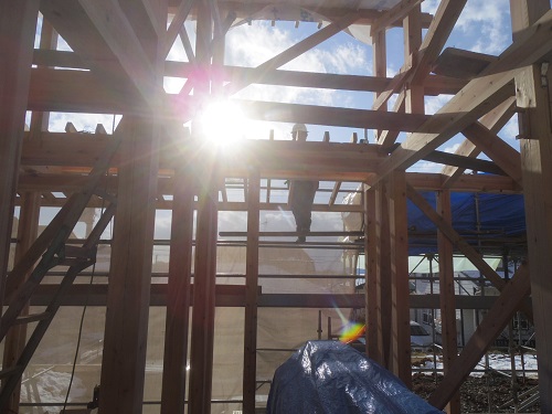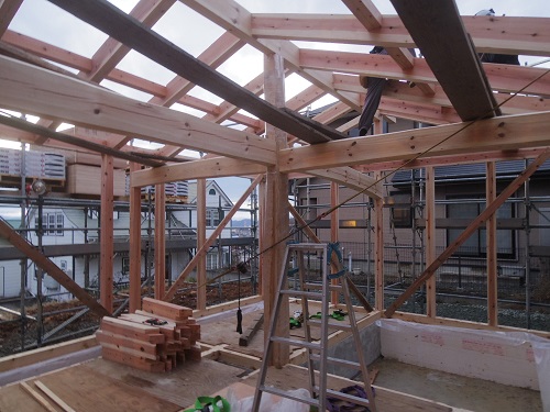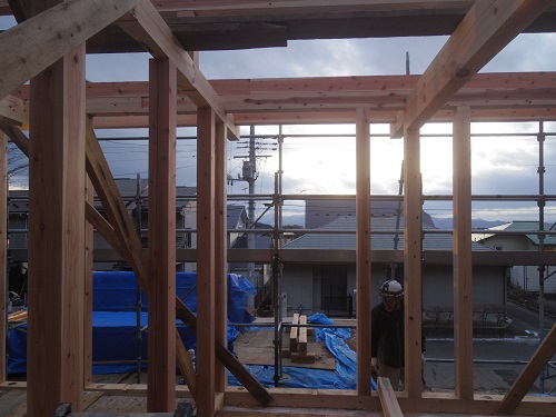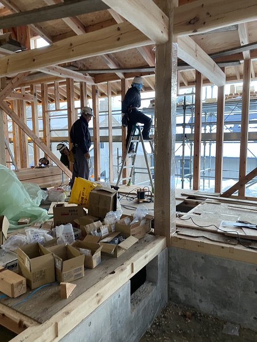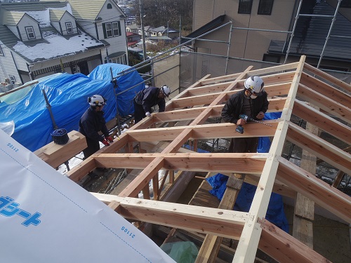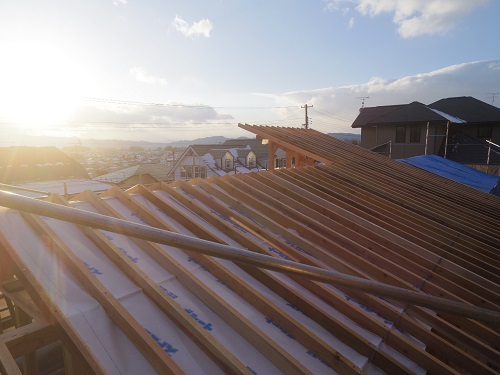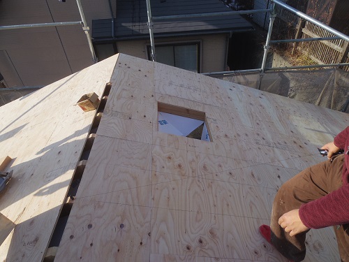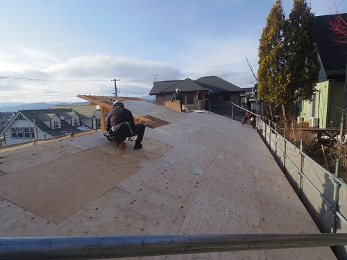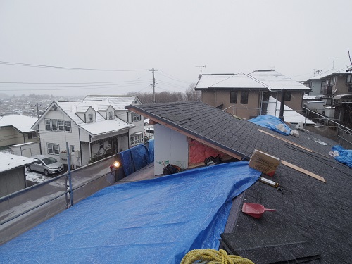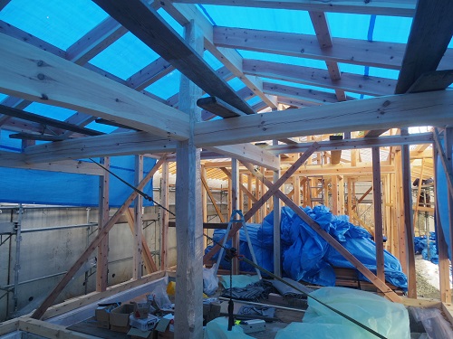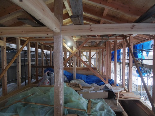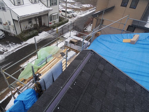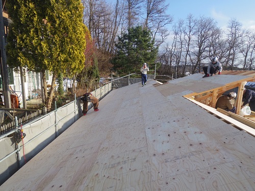 雪は降りましたが、何とか屋根を葺き上げて構造面材モイスの張込みも進めました。これで年越しは安心です。大工さんが頑張ってくれて有難いですね。