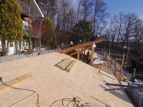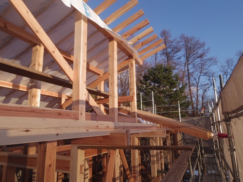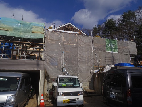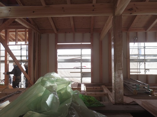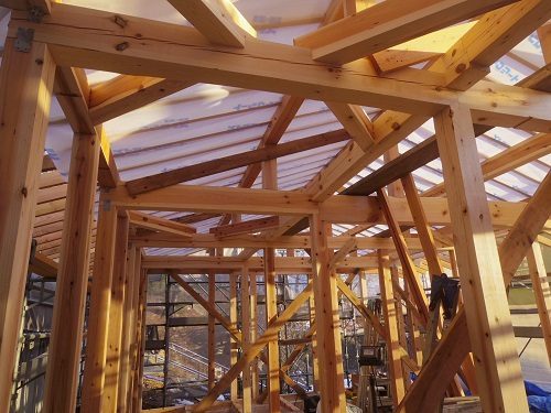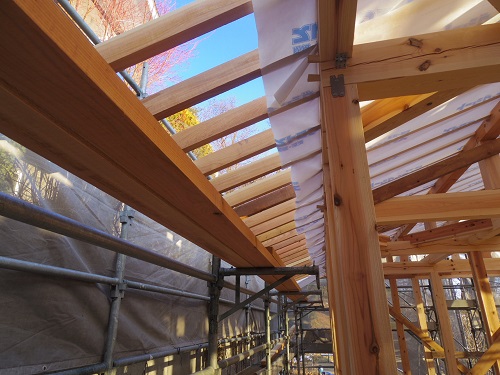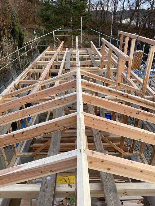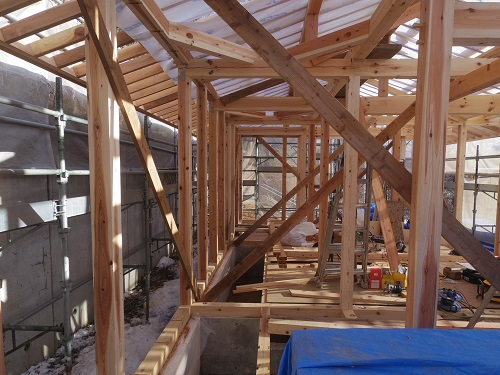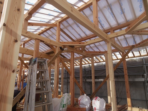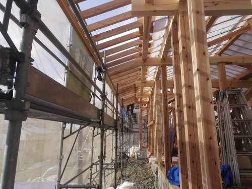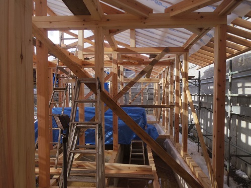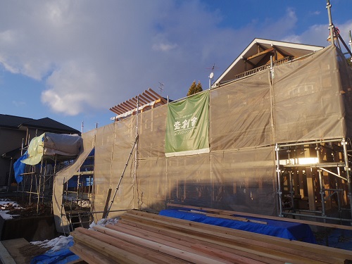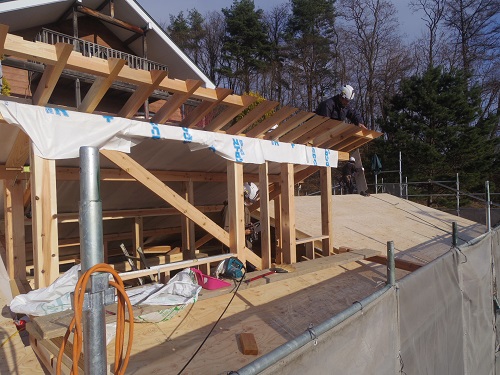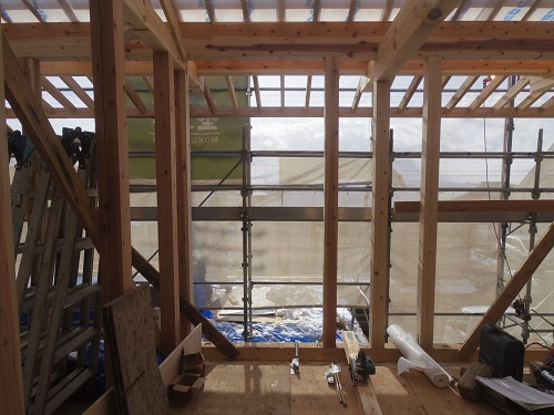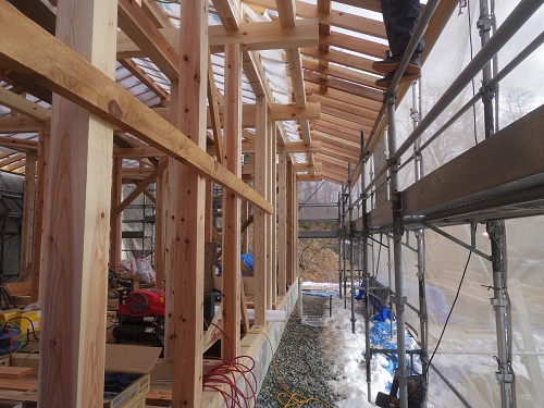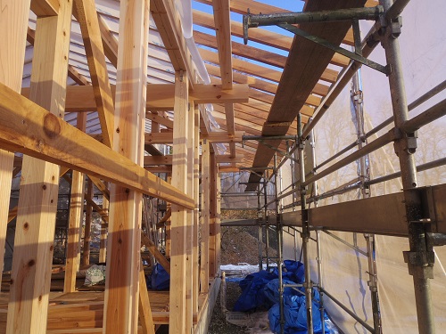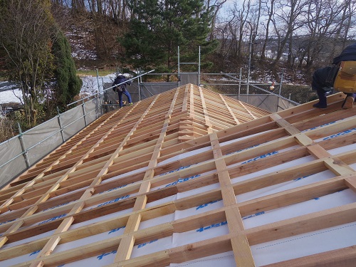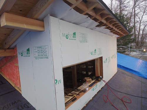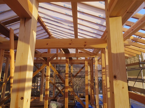 昨年末に屋根を葺き上げて、外部の構造面材モイスを張り込んで年越しさせて頂きました。