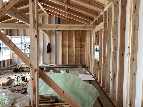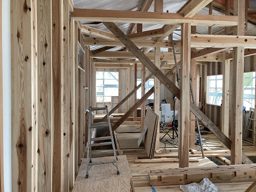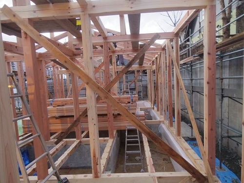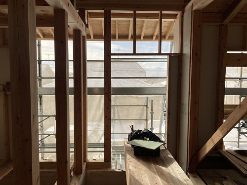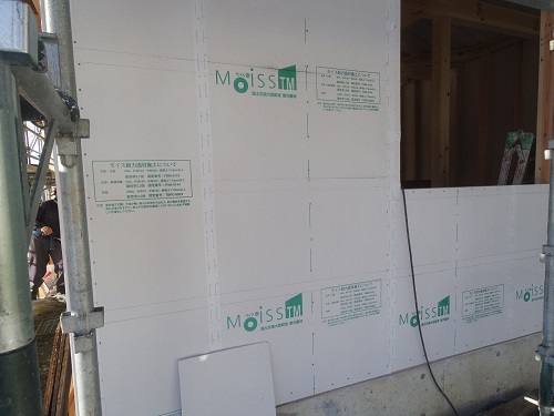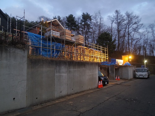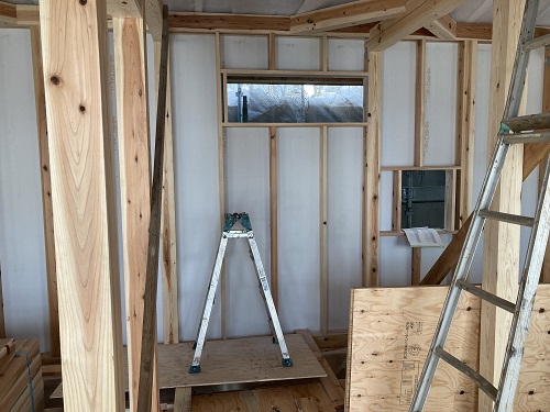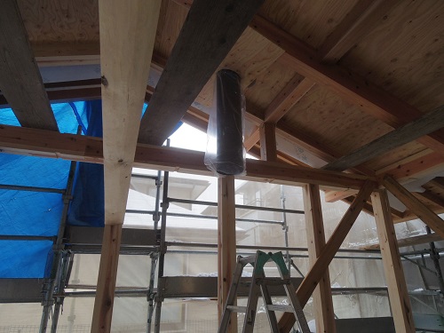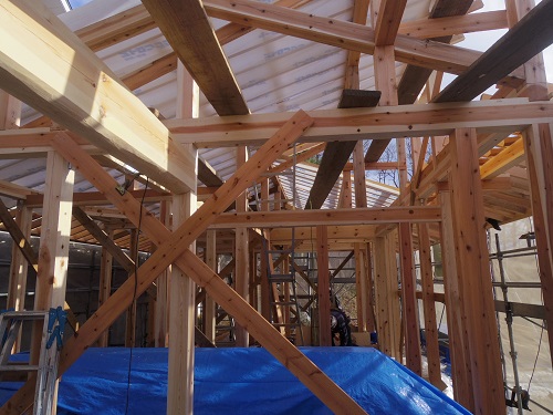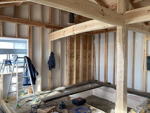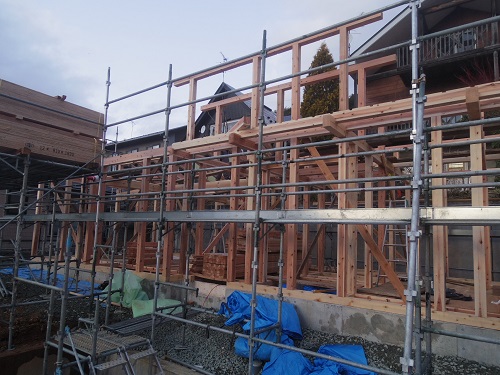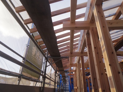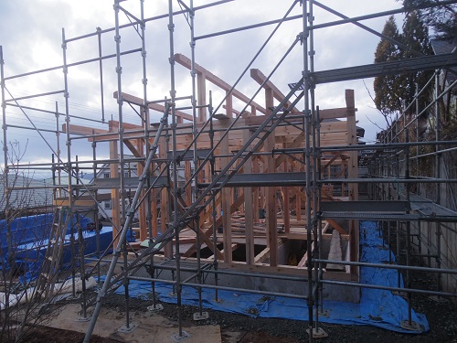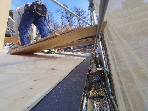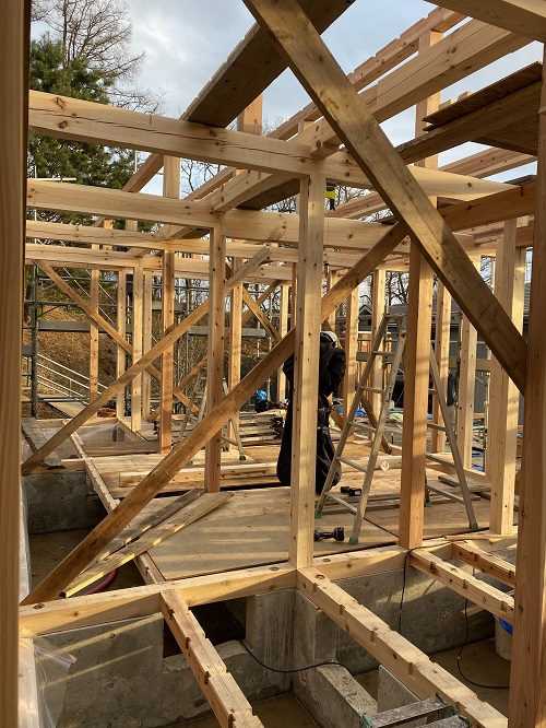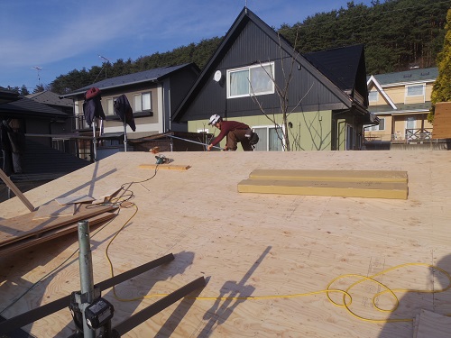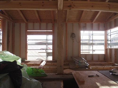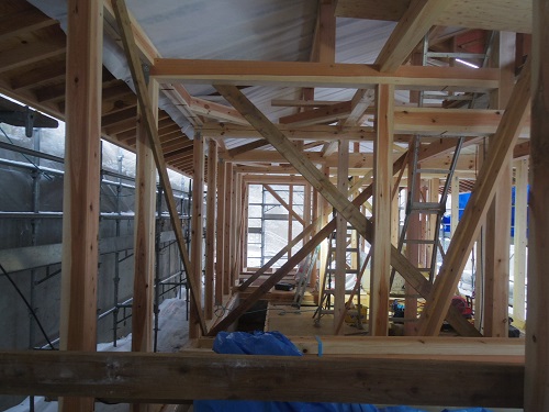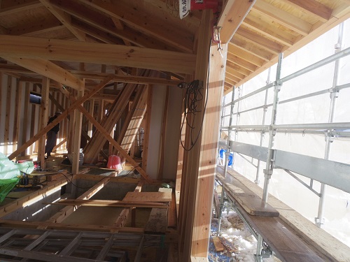 昨年末に屋根を葺き上げて、外部の構造面材モイスを張り込んで年越しさせて頂きました。