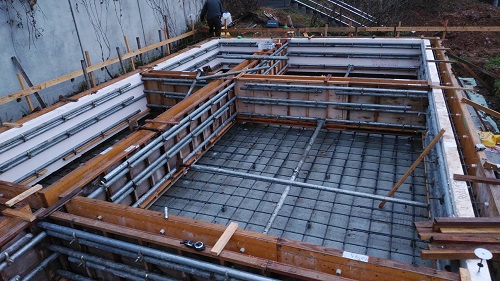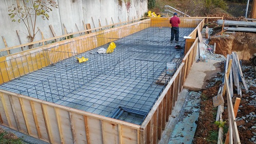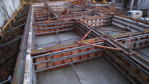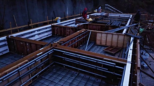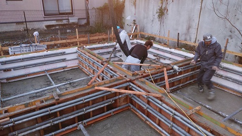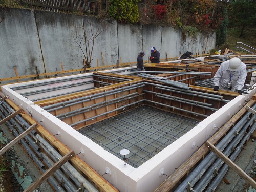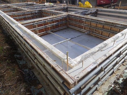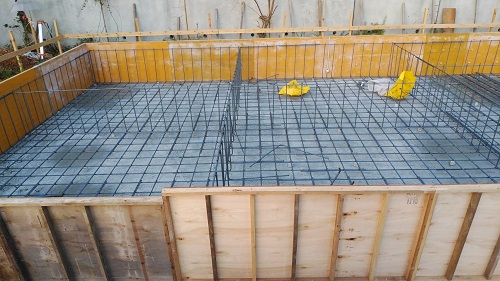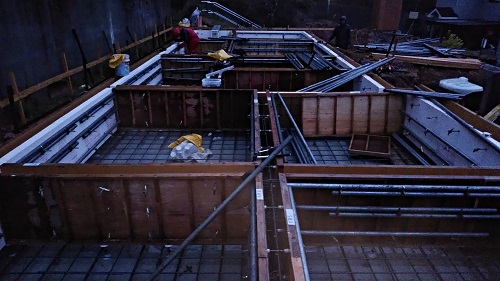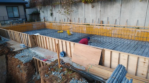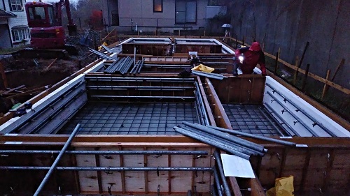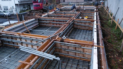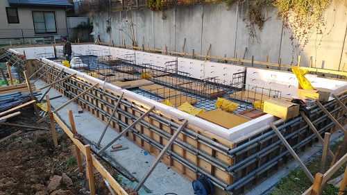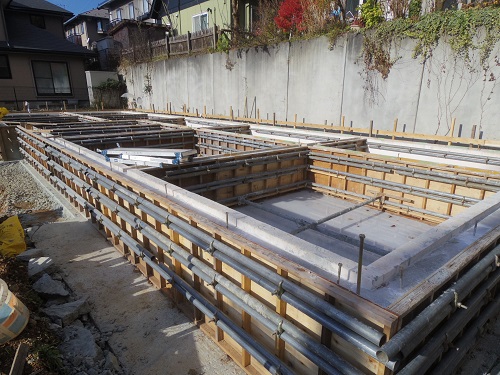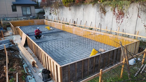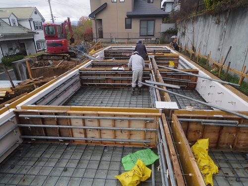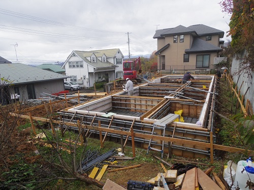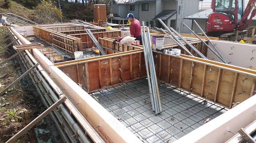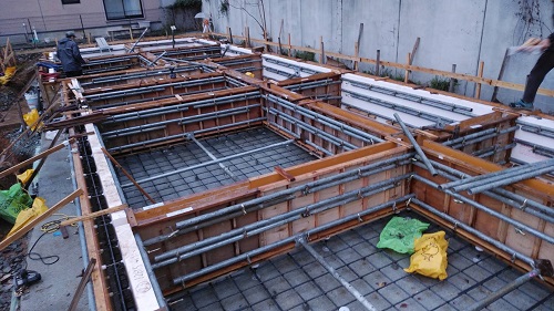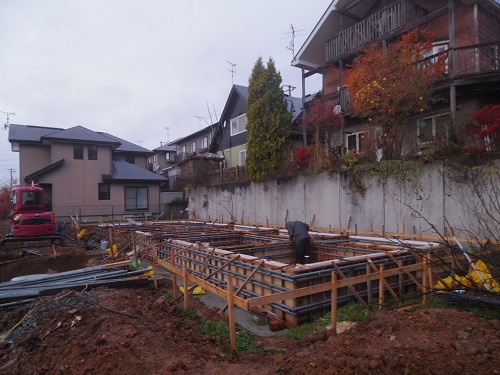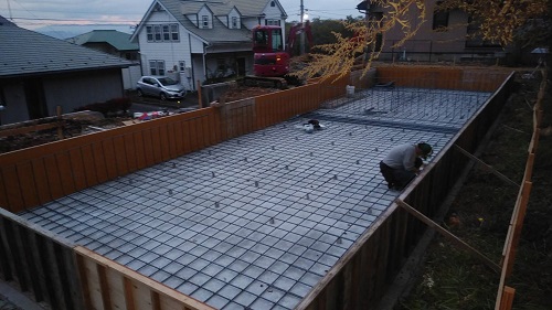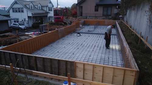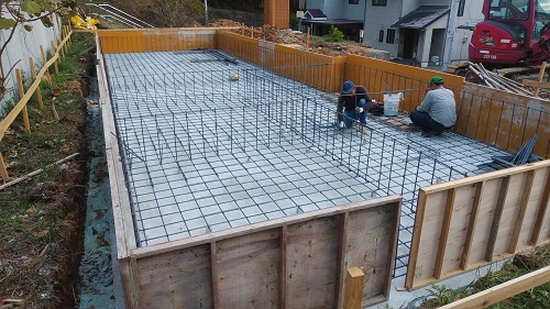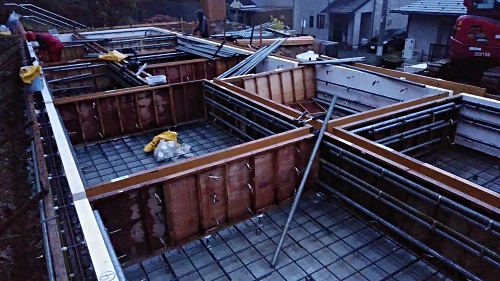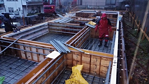 生憎の雨の中基礎内枠の取り付けを頑張っていました。見ての通り、浮かせ枠なので、耐圧盤と立ち基礎に打ち継ぎなくコンクリートが一体化する強度の高い基礎となります。