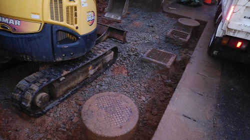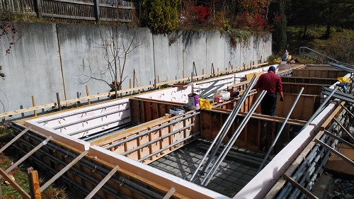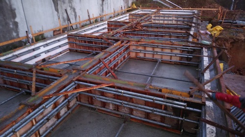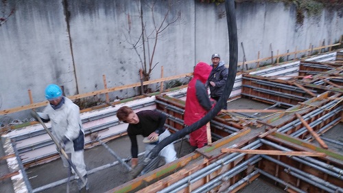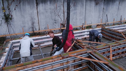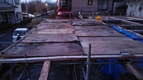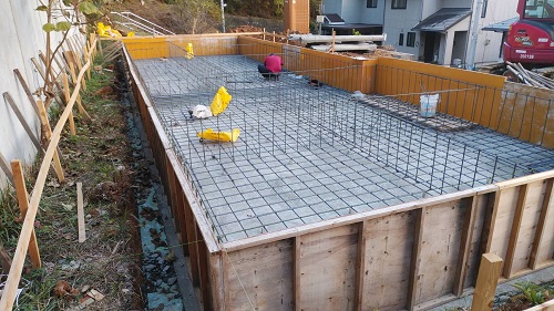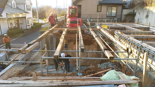 11日朝からの雨でも晴れの合間もあって、無事コンクリート打設が進みました。引き続き土留め擁壁工事へと進みます。