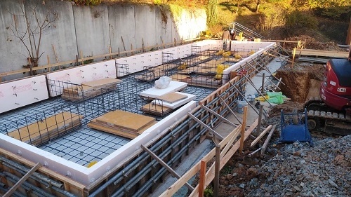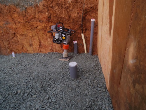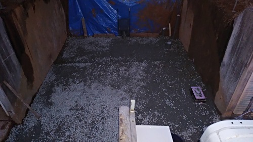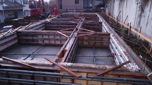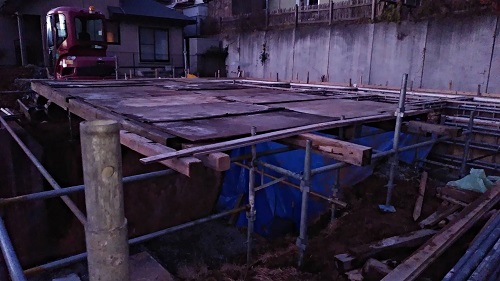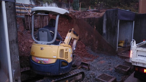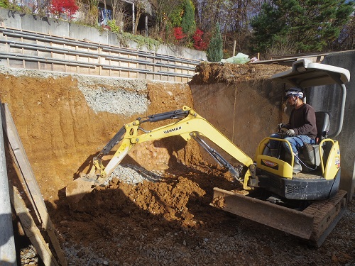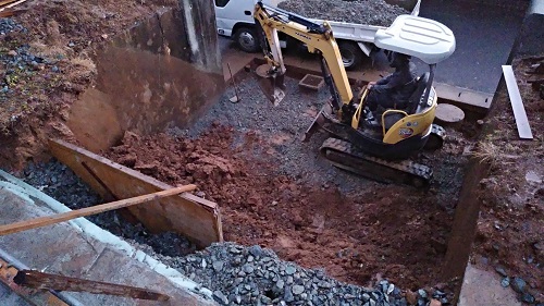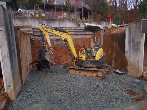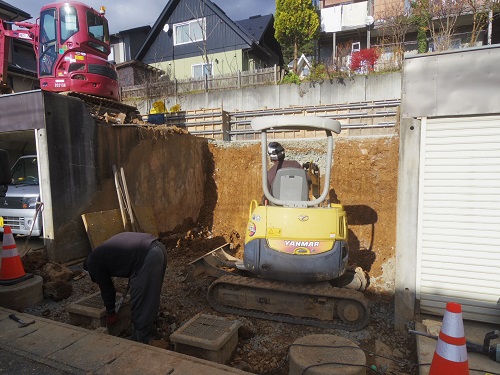 水道配管工事を待って車庫土間と土留め工事が再開しています。
