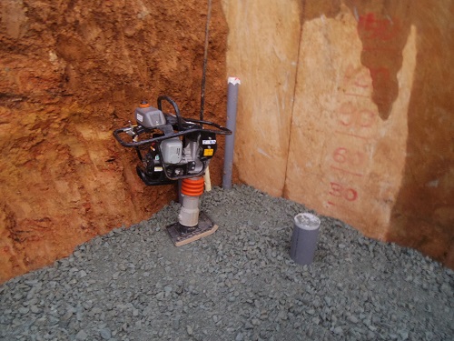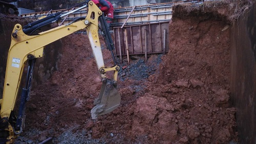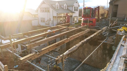 生憎の雨続きで、基礎天馬仕上げが進みませんが、土留め工事を雨の中取り組んでいました。
