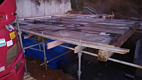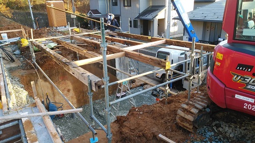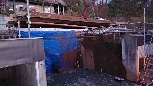 いよいよ雪の季節が到来したので、作業床兼用の雪除け屋根を設けてから土留め配筋を進める事となりました。
