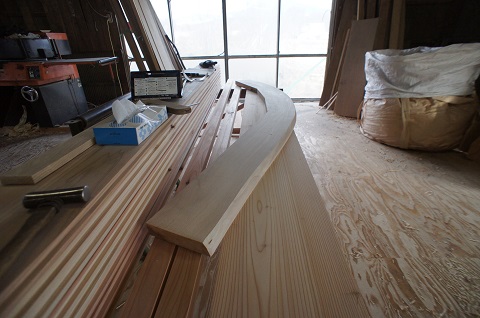 宮古の新築現場の玄関框を準備加工しました。楢のブーメランカーブしている一枚板で、床材にも合わせ同一樹種を揃える事が出来ました。丸太の段階からの曲がりを生かしています。