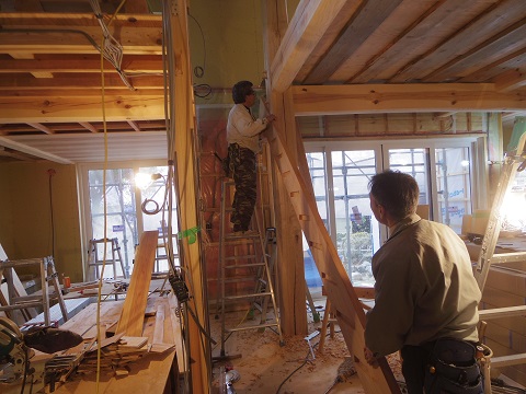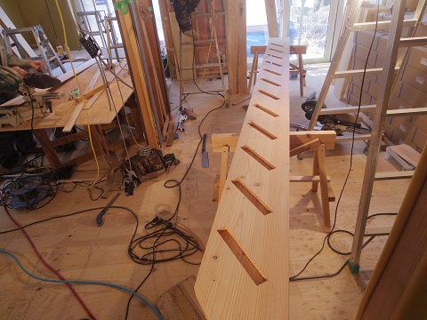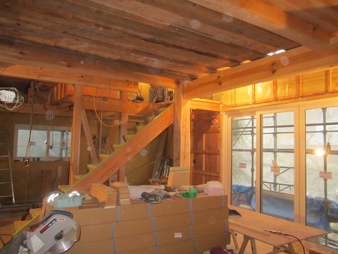 階段を造る大工と天井を張る大工さんの連携で工事が進んでいました♪