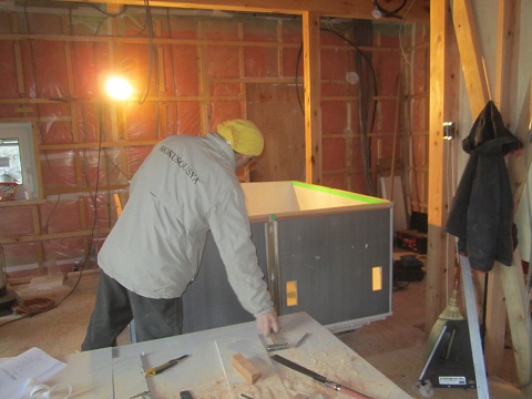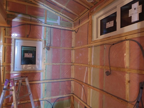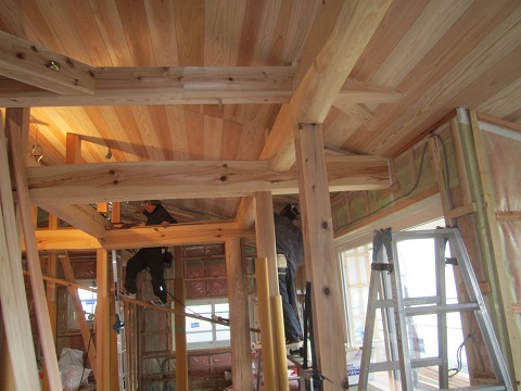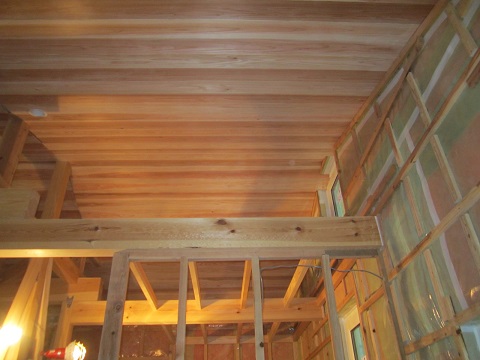 斜め天井の杉板も大方張り込まれて良い雰囲気になってまいりました。