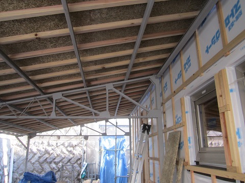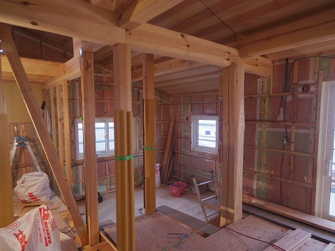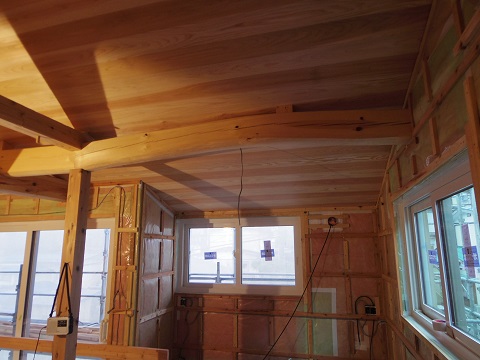 宮古の新築工事は内部の下地と斜め天井板の取り付けがすすみました。