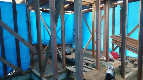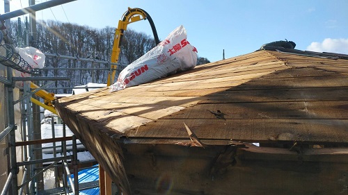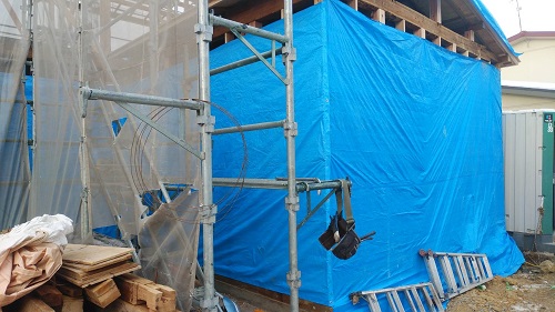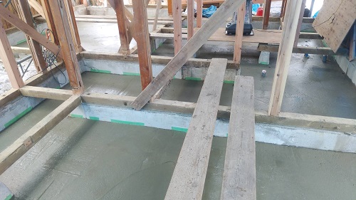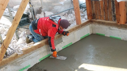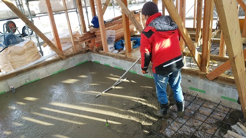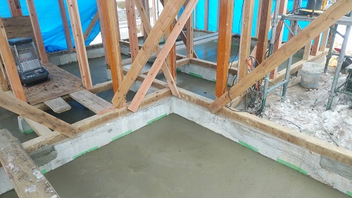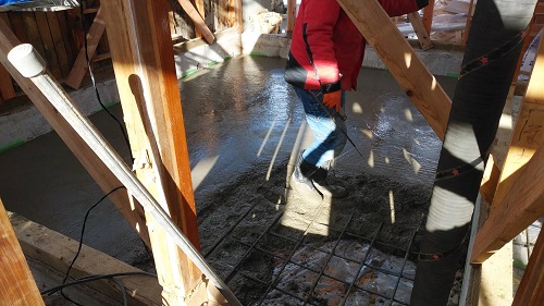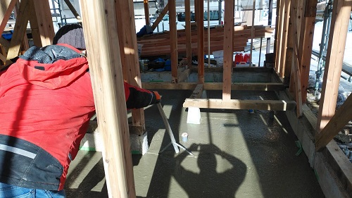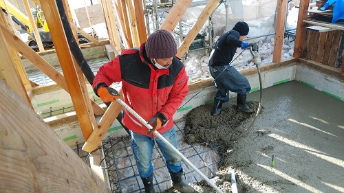 昨日コンクリート打設をしました。建物をガッチリと囲い込んで夜通し暖房を焚いて温めていました。
