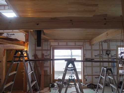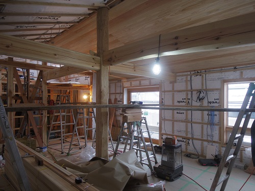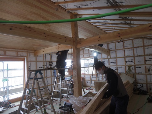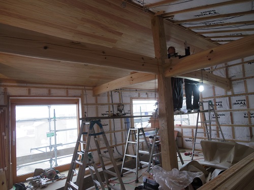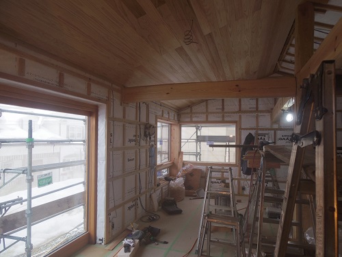 電気配線が進んだので、斜め天井の杉板張りも進んでいます。